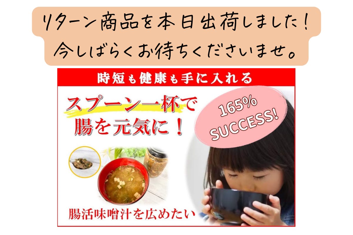 2024/01/09 16:04「時短も健康も手に入れる!スプーン1杯で腸を元氣にする腸活味噌汁を広めたい」プロジェクトオーナーの伊原由実子です。この度はご支援いただきまして誠にありがとうございます。ご支援されたリターンの発送手続きが完了いたしましたので、ご報告させていただきます。リターンがお手元に届くまで、今しばらくお待ちくださいませ。なお、今後はこちらのサイトで購入することができます。https://hcgift.buyshop.jp/items/79093693改めて、ご支援いただきまして誠にありがとうございます!今後ともどうぞよろしくお願いいたします。 もっと見る
