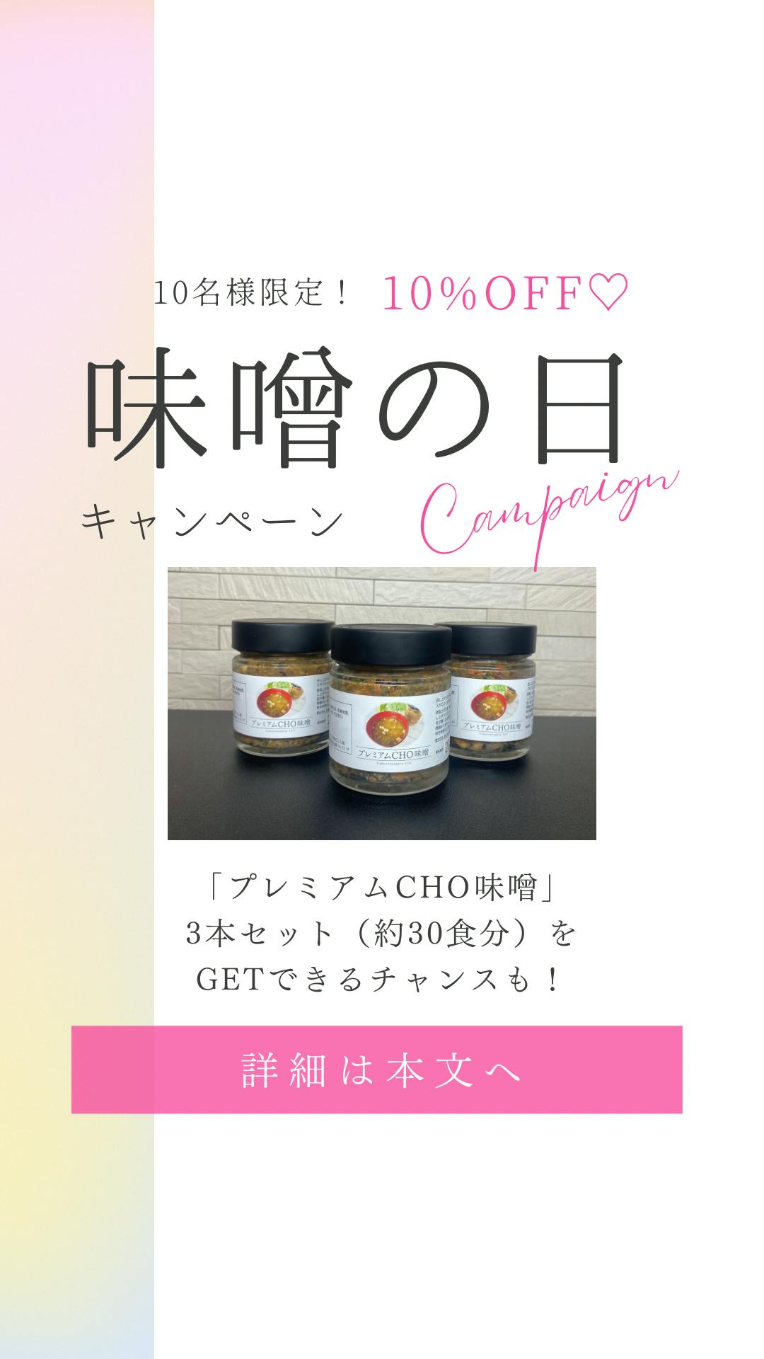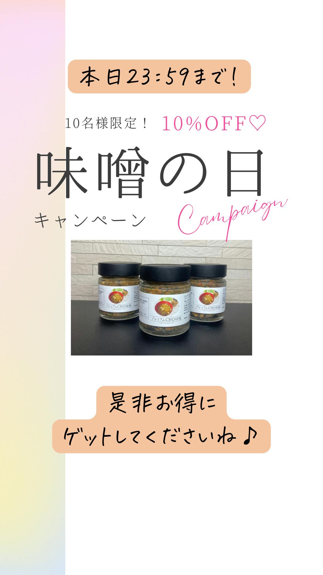 2024/02/29 15:14【今日は2月の味噌の日キャンペーン!】毎月30日は「晦日(みそか)」にちなんで「味噌の日」なのですが今月は30日がないので月末の今日が「味噌の日」となります!本日限定で腸活味噌汁「プレミアムCHO味噌」をお得に購入できるイベント開催中です!題して「味噌の日限定!お味噌汁でありがとうを伝えよう!」キャンペーン!いつも頑張る自分に「ありがとう」離れて暮らす家族に「ありがとう」お世話になっているあの人に「ありがとう」今思い浮かぶ誰かに「ありがとう」をプレゼントしましょう!本日2月29日(木)限定で10%オフ!こちらのページで購入できます♪https://hcgift.buyshop.jp/「日本の朝食に味噌汁を」お味噌汁を飲む文化を改めて作っていきましょう! もっと見る