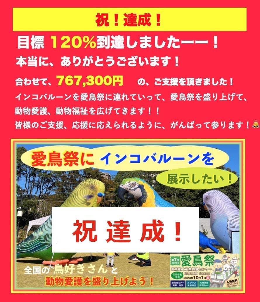 2023/09/18 17:18この度は、鳥さんのためのクラウドファンディングに、ご支援いただき、本当にありがとうございました。合計 767,300円 当初目標の120%の ご支援をいただきました。 「鳥さんの世界をより良くしたいと思う優しい気持ち」 「愛鳥家としての ゆるぎない責任感」 「未来を創っていこうとする強い意志」多くの皆さまの そんな想いが積み重なったクラウドファンディングでした。そのおかげで、インコバルーンたちを『愛鳥祭』に連れていくことができます!世界一大きなインコバルーンを、4年ぶり過去最大の『愛鳥祭』に展示して、たくさんの愛鳥家さんたちと共に、動物愛護・動物福祉を広めてきます!NPO法人ハッピーインコ 代表理事 芳賀秀樹 もっと見る