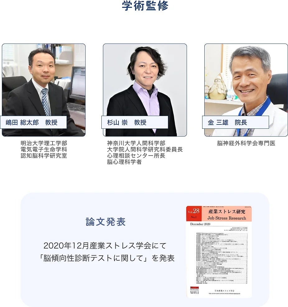 また、2020年12月に産業ストレス学会にて「脳傾向性診断テストに関して」を発表し、学術的に信頼のおけるものとなっております。