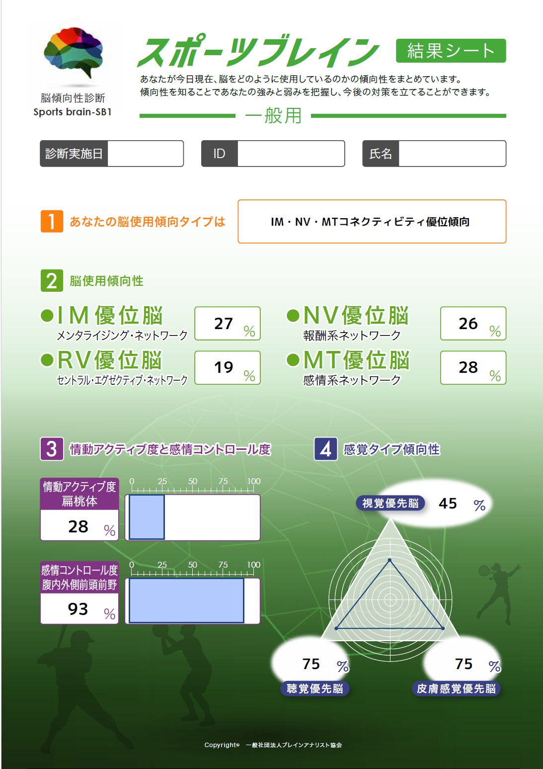 この診断では、あなたの「脳の強み・弱み」「脳の得意・不得意」「感情の強さとコントロール度」「脳思考傾向性」「感覚タイプ傾向性」が数値で表示されます。この診断でも、スポーツブレインの特徴である「感覚タイプ傾向性」が分かります。