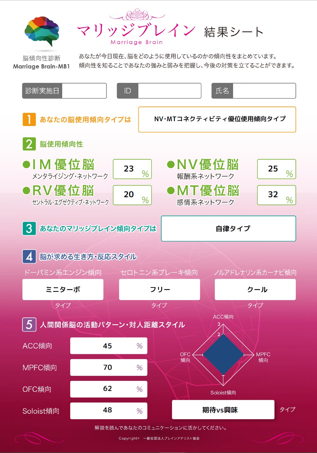 この診断では、あなたの「脳の強み・弱み」「脳の得意・不得意」「脳が求める生き方・反応スタイル」「人間関係脳の活動パターン・対人距離スタイル」が数値で表示されます。