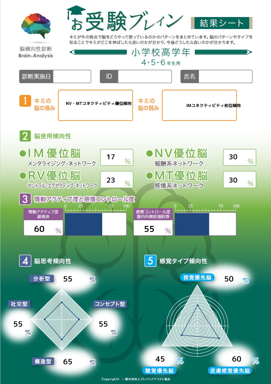 この診断では、あなたの「脳の強み・弱み」「脳の得意・不得意」「感情の強さとコントロール度」「感覚タイプ傾向性」 が数値で表示されます。