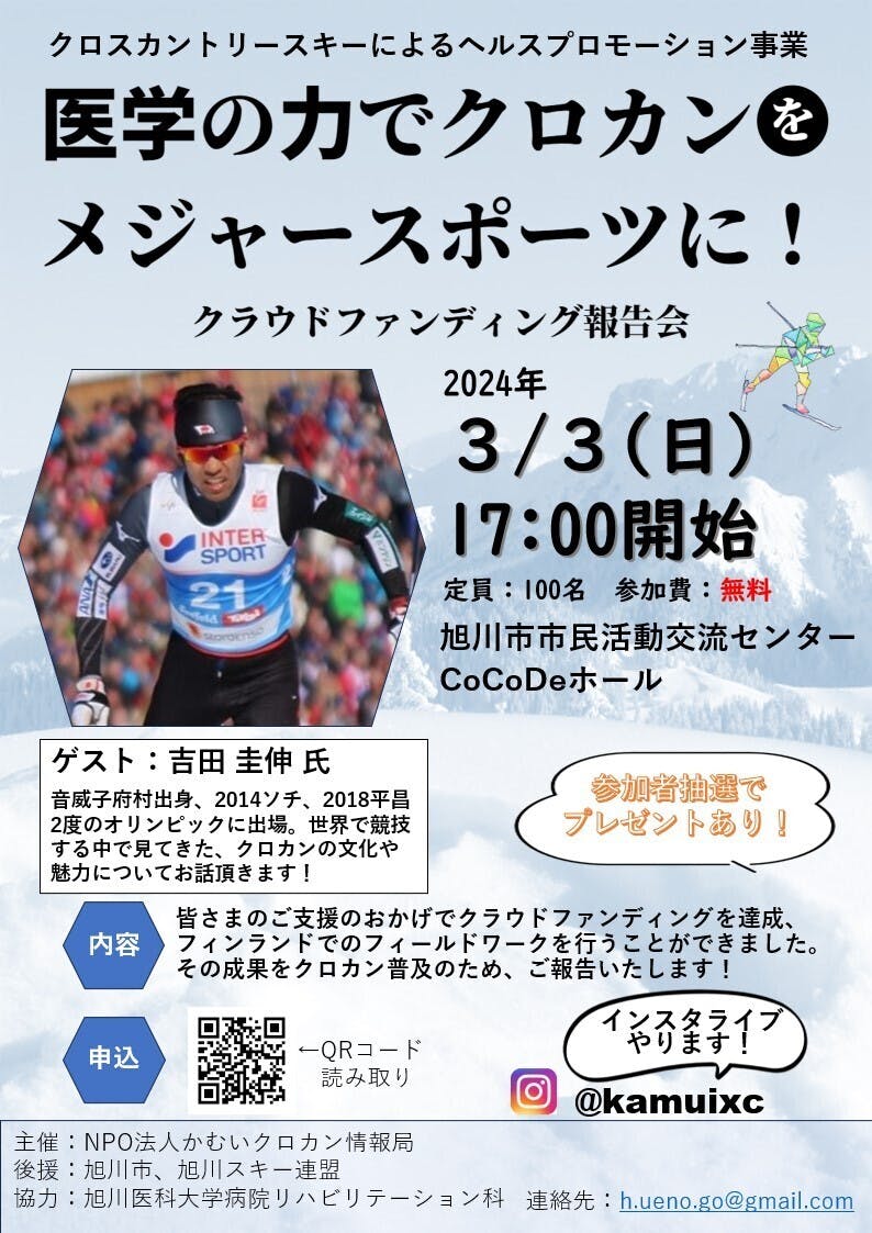2024/01/25 11:17昨年、多くの方々のご支援によりクラウドファンディングを達成し、フィンランドで「クロスカントリースキーと健康」に関する研究について学んできました。また、競技に携わる立場でなくクロカン先進国に赴き、その文化の豊かさについて見てきました。それらの成果を、今後国内でのクロカン普及に活かすため、旭川で報告会を開催いたします。当日はスペシャルゲストとして「吉田圭伸さん」にご参加いただきます!参加者へのプレゼントもございます。日時:2024年3月3日(日)17:00~会場:旭川市市民活動交流センターCoCoDeホール人数:先着100名申込:https://forms.gle/2g68gKNFUDLRNbmt6バーサーロペット・ジャパン前週の開催です。旭川開催ですが、インスタグラムでのライブを行おうと考えています。多くの方々に聞いていただきたいと考えております。どうぞよろしくお願いします! もっと見る
