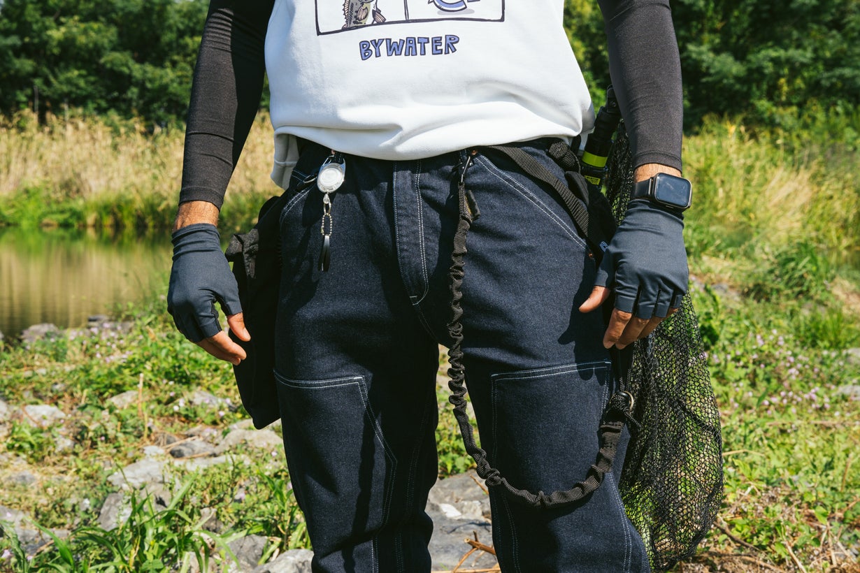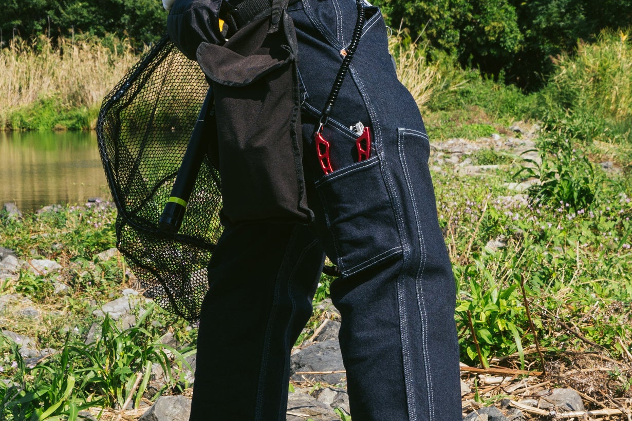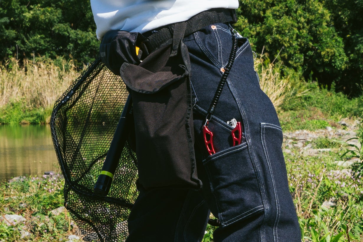 腰にランディングネットを挿しておくことで、手早く使えるだけでなく、置き忘れも防げます。※Fisherman's Stretch Denim Workpants|KIGEN(ORI-St)着用
