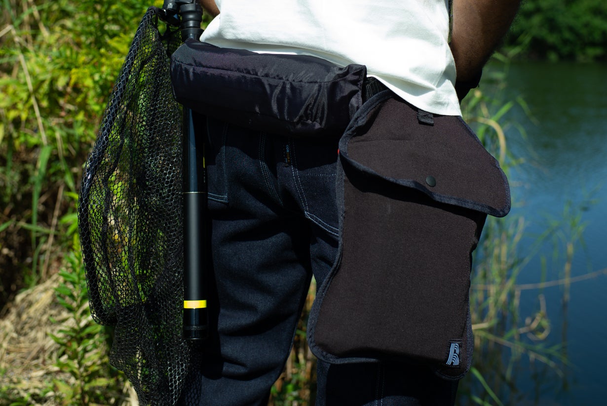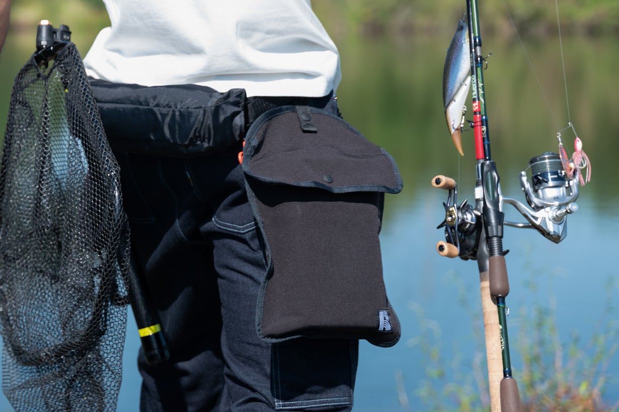 従来通り左腰にランディングネットをつけることが可能です。※Fisherman's Stretch Denim Workpants|KIGEN(ORI-St)着用