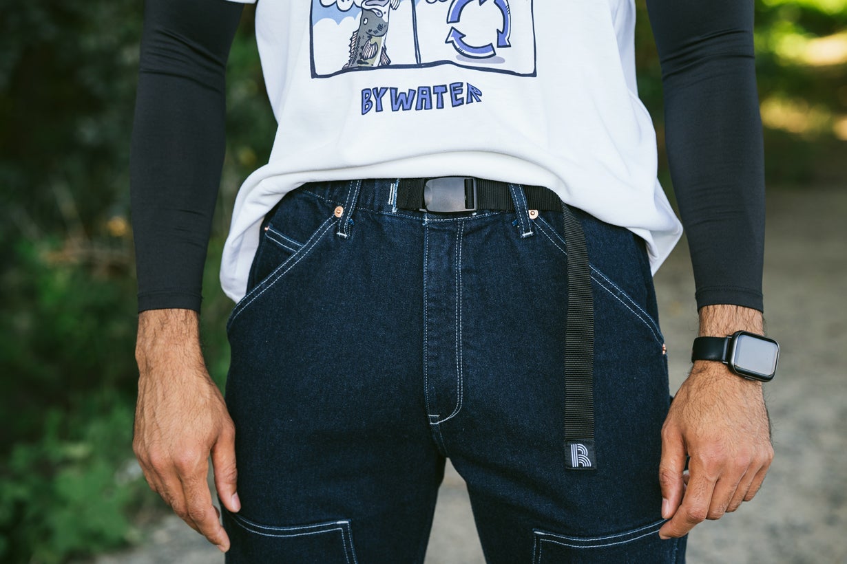 右腰にも同様にベルトがついています。※Fisherman's Stretch Denim Workpants|KIGEN(ORI-St)着用