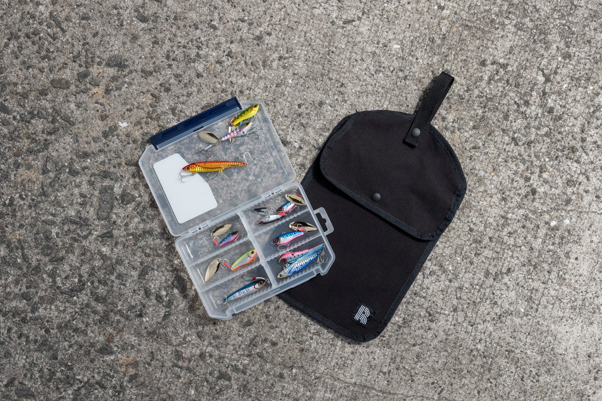 バス釣りに使ってみました。オプションの「KOBANZAME」(※後述)も併用で、これだけの道具をそれぞれのポケットに分けて収納できました。※Fisherman's Stretch Denim Workpants|KIGEN(NTP-St)にて撮影