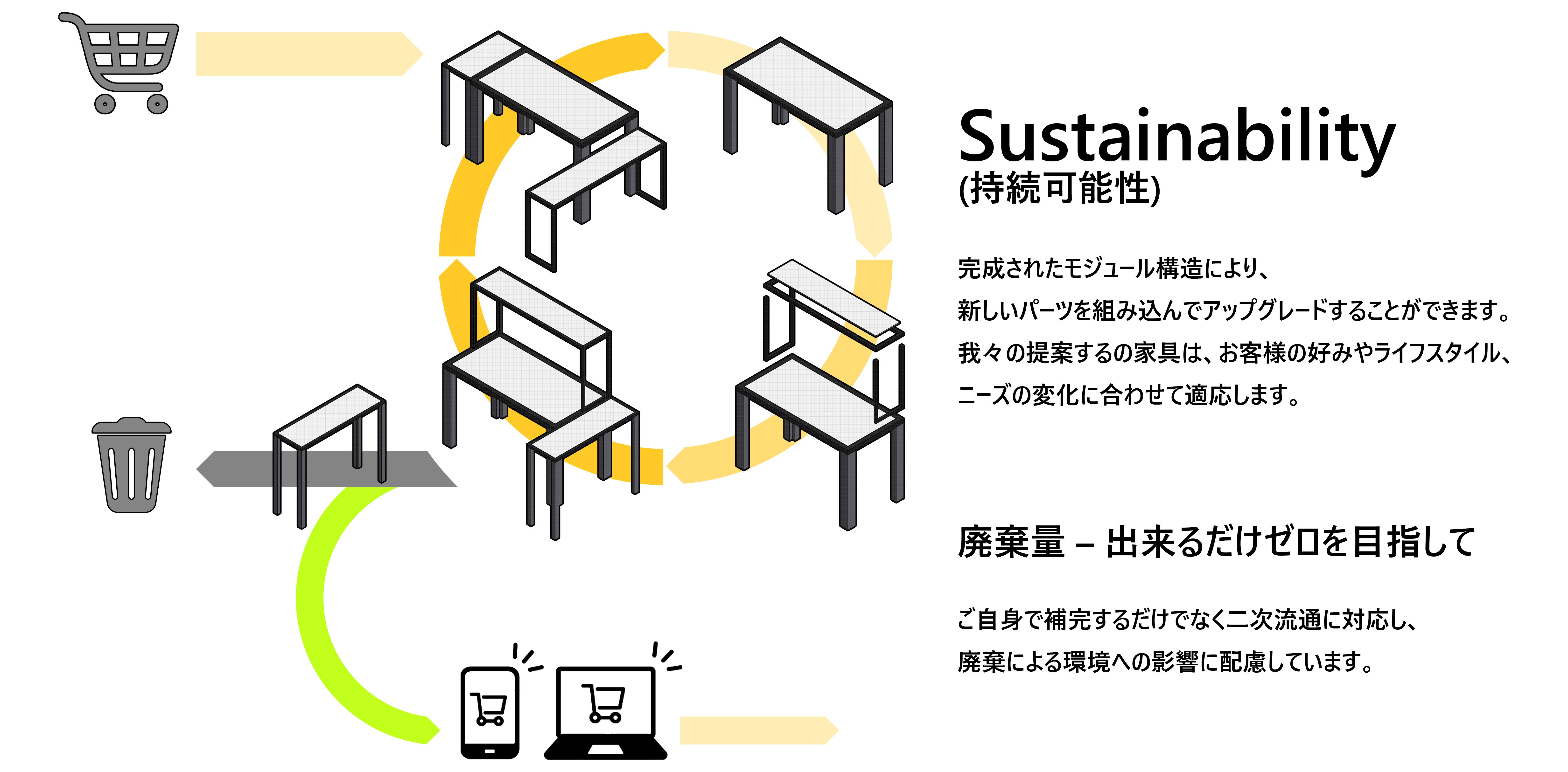 より長く、より愛せる製品- モジュール単位でデスク・棚を構成することができるので、自身のライフスタイルに合わせて製品をカスタマイズすることにより、デスクを長く利用することが可能です。