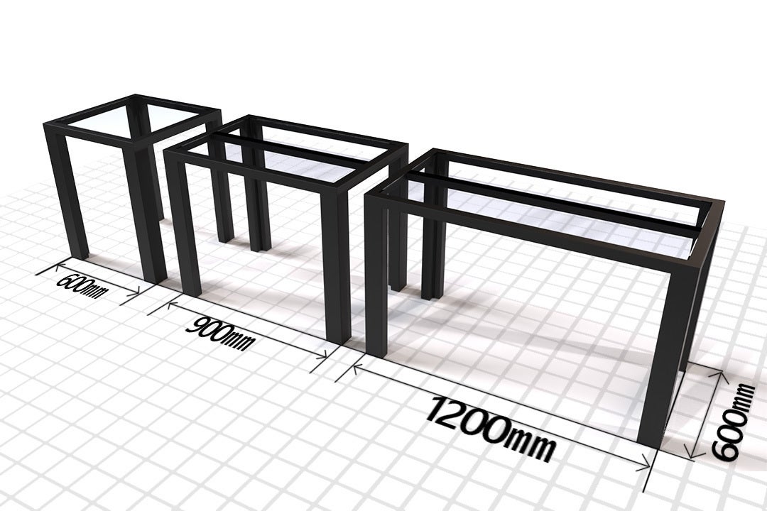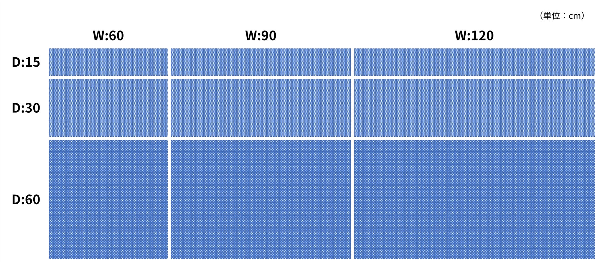 様々な用途に合うように、横幅が60cm,90cm,120cmと、奥行きが15cm,30cm,60cmの計9種類の天板サイズを提供予定