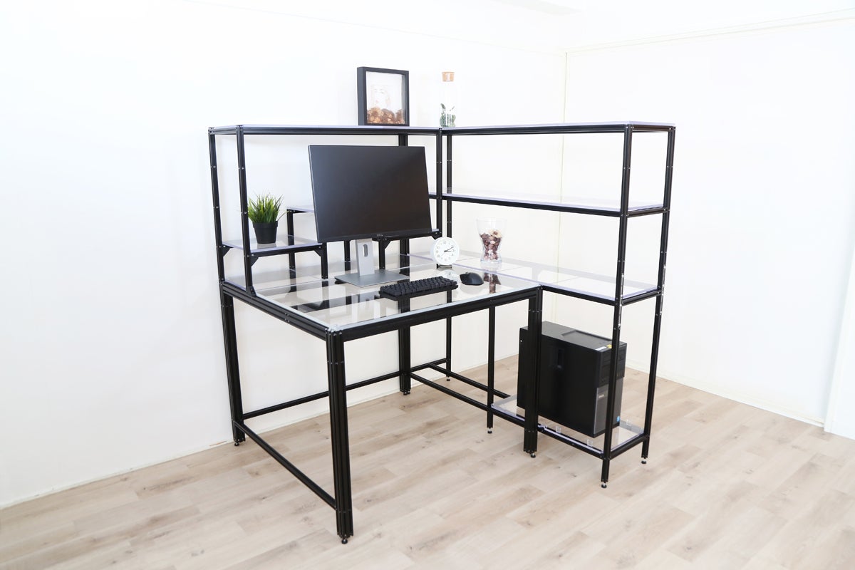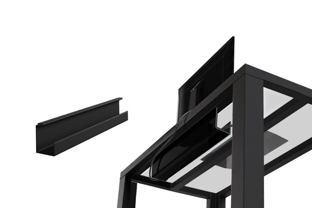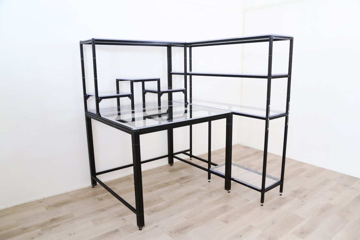 黒基調のアルミフレームと透明天板を組み合わせることで遊び心を持ちつつ、高級感とスタイリッシュさを兼ね備えたデスクを実現しています。