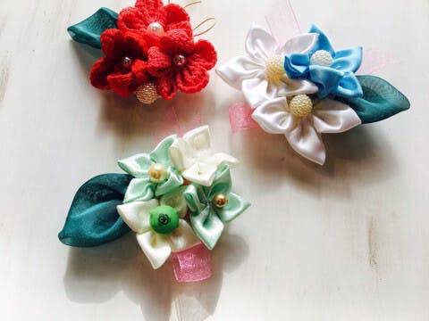 物品でのリターンには、私の友人が、伝統技法で作ったつまみ細工の作品をお届けいたします。ブローチとバッグチャームなどがありますが、何が届くかはお楽しみでお願いします。