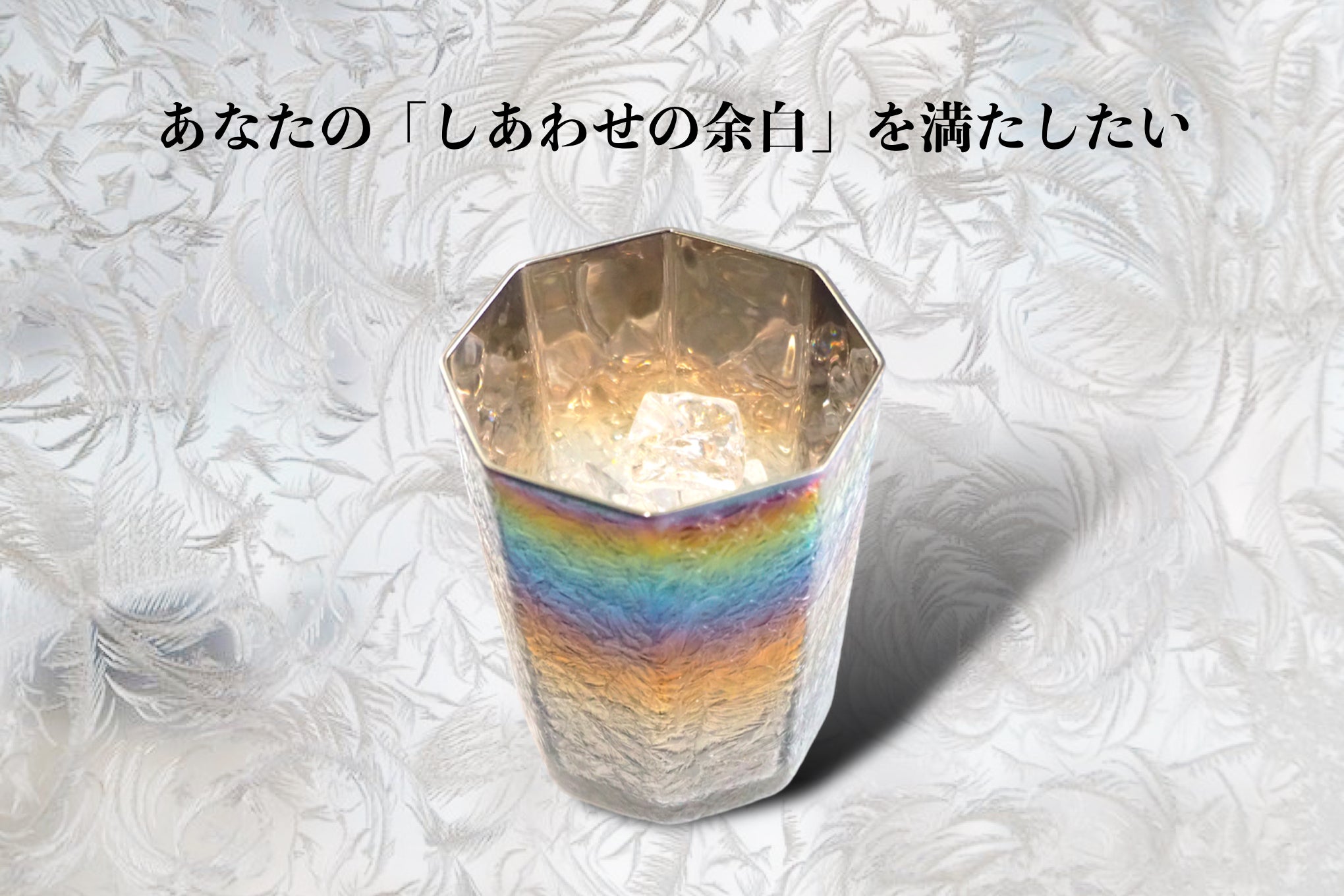 「HAKKEI-八景-」の特徴である結霜模様は、無垢の硝子では表現できない光の陰影と妖艶な柄がチタンの色彩とあいまって奥ゆかしく輝きます。