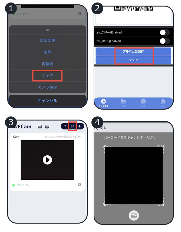 ②上のQRコードをスマホのアルバムに保存し、招待される方に転送します。あるいは、直接に「iWFCam」から招待される方にシェアします。