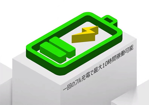 リチウム電池が内蔵され、ケーブルや電源などの複雑な設置は不要!フル充電後は最大10時間の連続稼働が可能です。