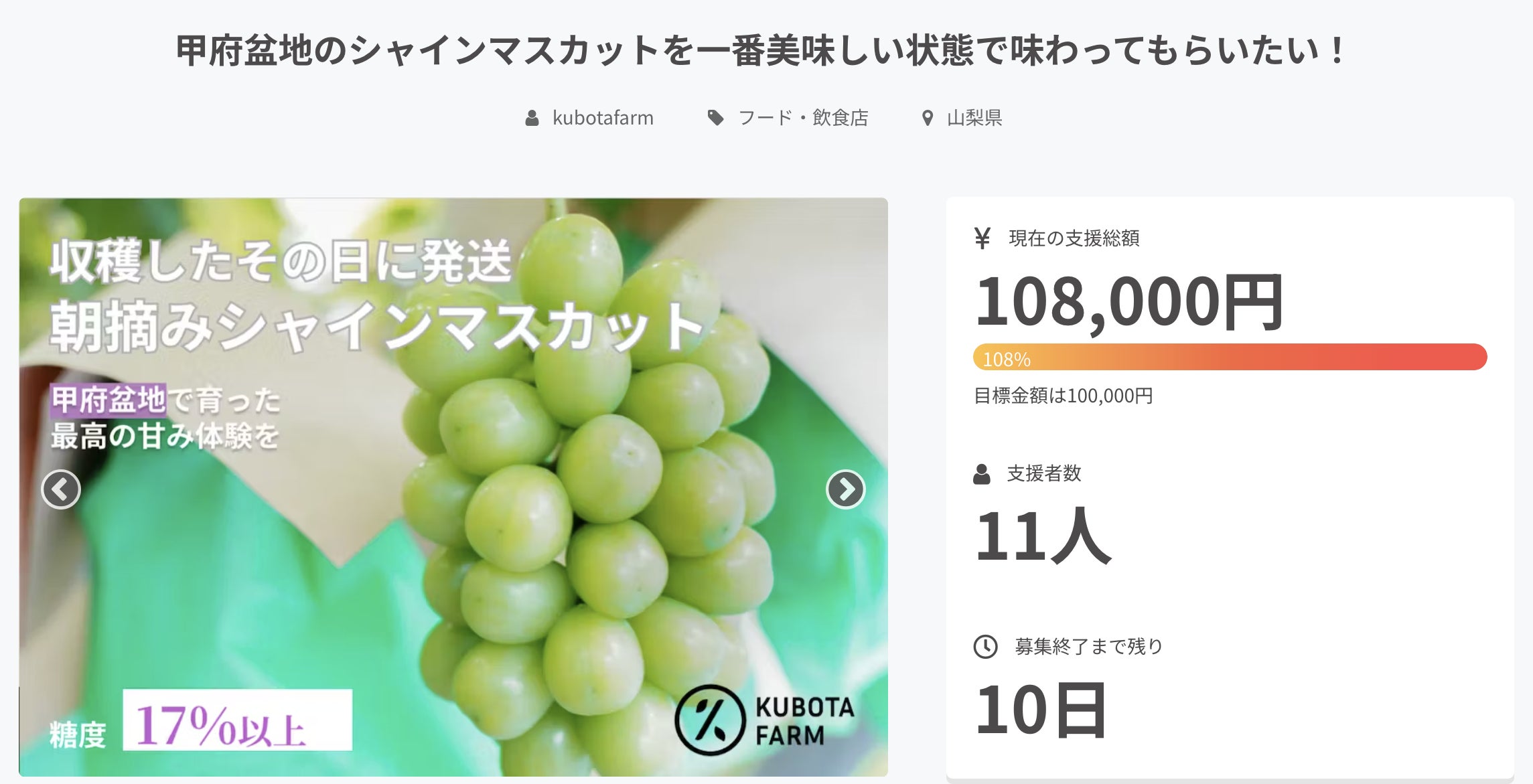 目標金額達成は達成しましたが、山梨県甲府のシャインマスカットを多くの人に最高の状態で味わってほしいという目標はまだまだ夢半ばです。