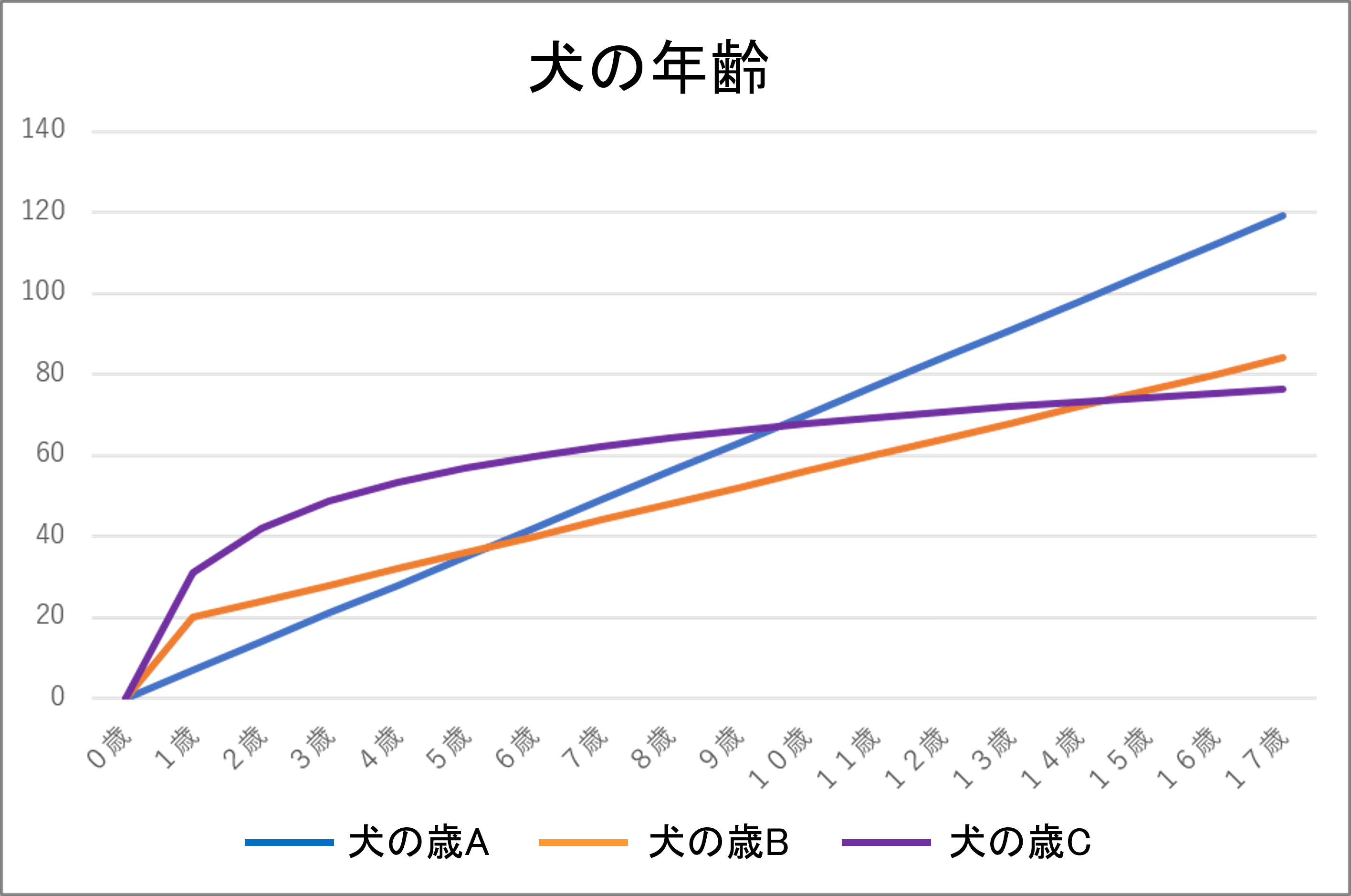 上の図では犬の年齢計算をA・B・Cのグラフにして表しました。 |