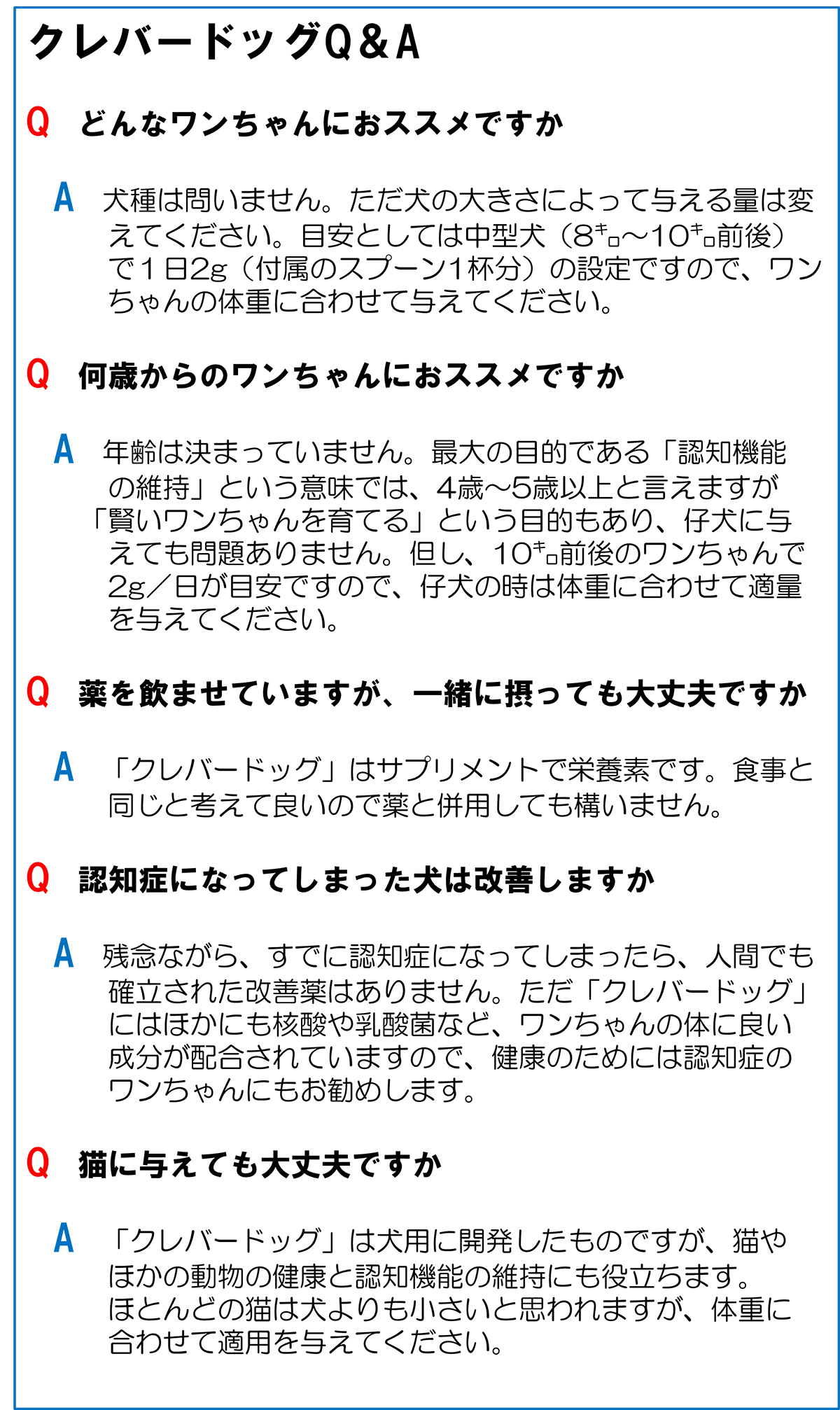 私たちは愛犬のための〝あたまのサプリ〟を『クレバードッグ』と名付けました。クレバーとは〝賢い〟とか〝頭がいい〟〝聡明な〟という意味です。歳をとっても元気で、家族との絆を忘れない、健康で賢いワンちゃんでいてほしい。そんな思いから付けました。