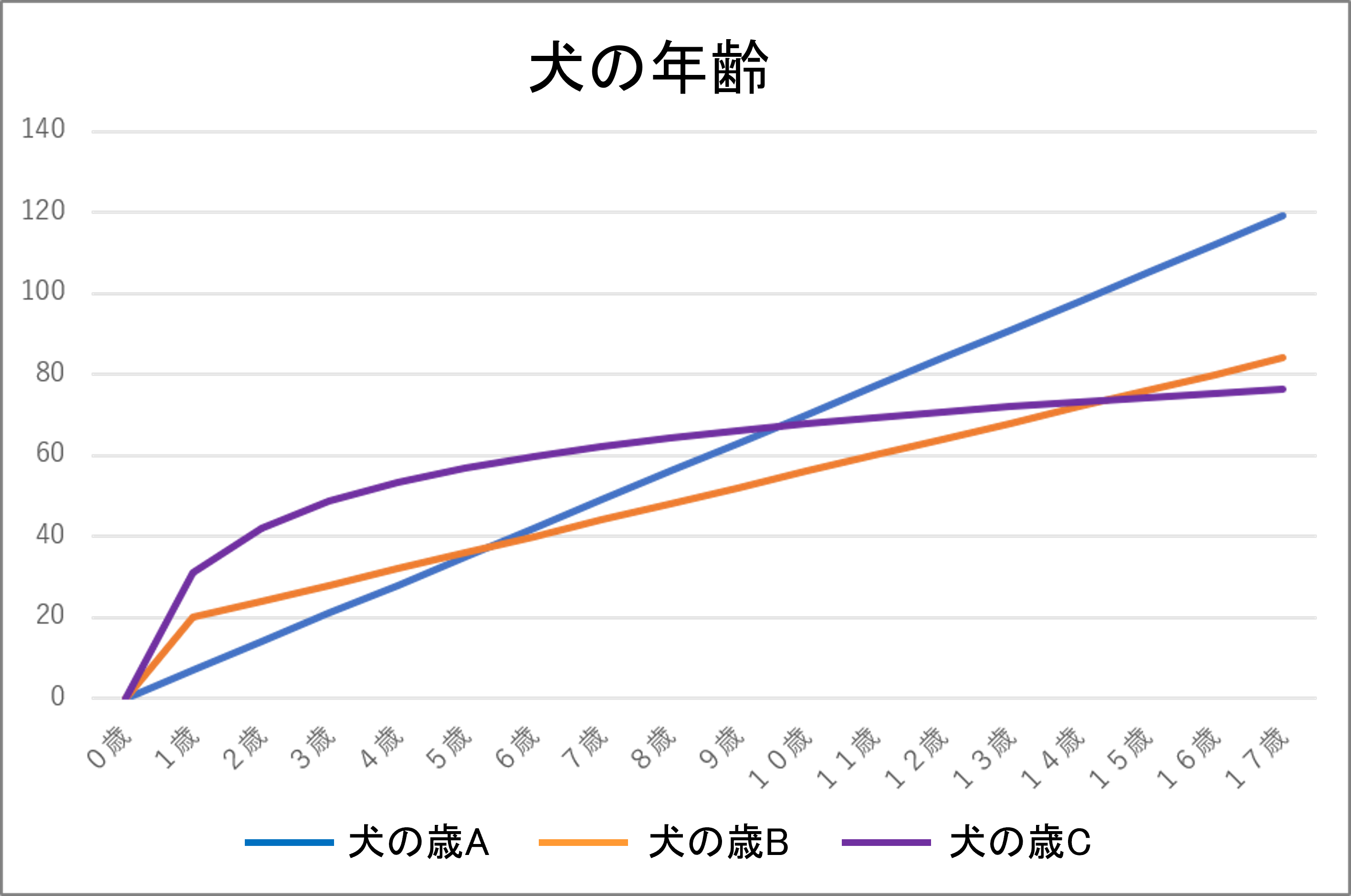 上の図では犬の年齢計算をA・B・Cのグラフにして表しました。 |