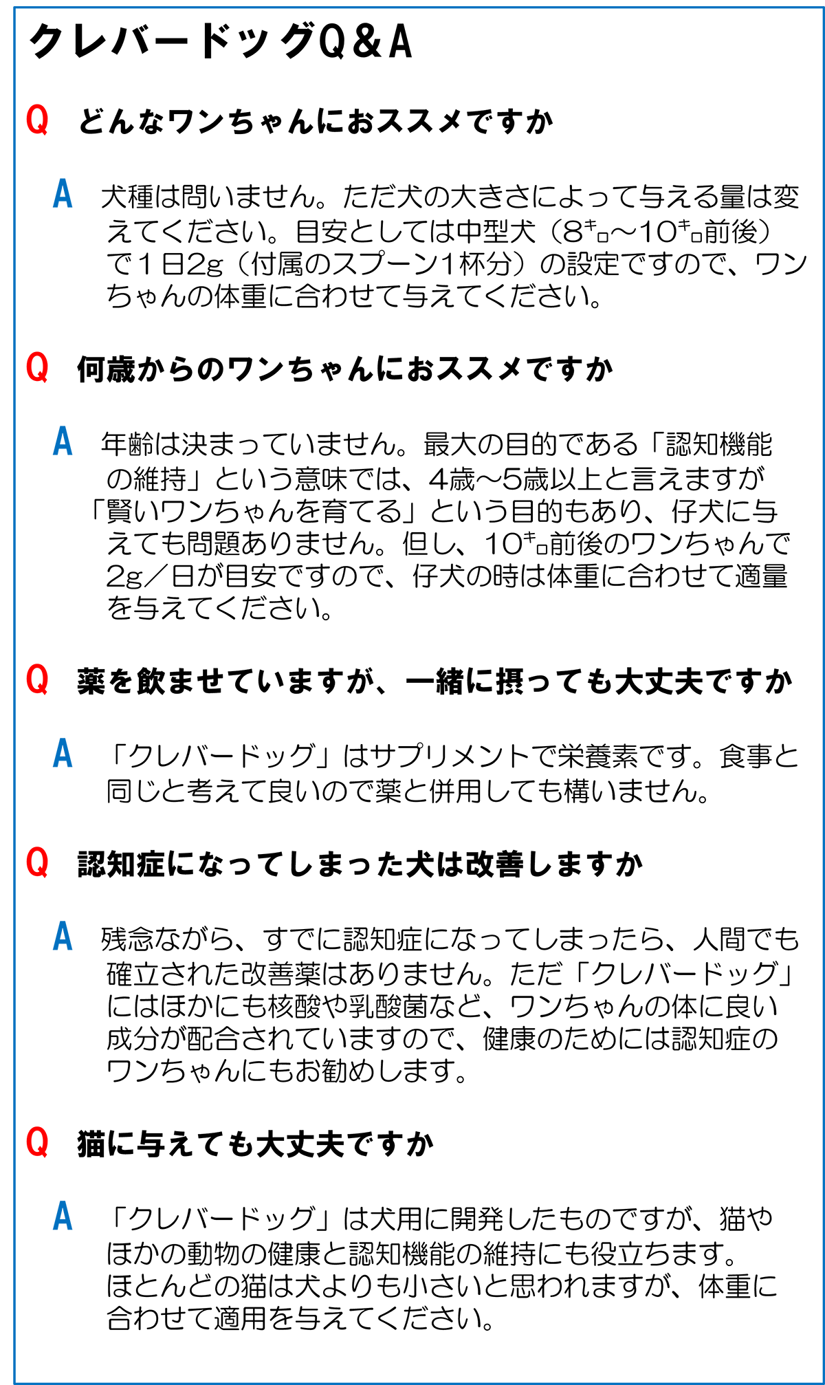 私たちは愛犬のための〝あたまのサプリ〟を『クレバードッグ』と名付けました。クレバーとは〝賢い〟とか〝頭がいい〟〝聡明な〟という意味です。歳をとっても元気で、家族との絆を忘れない、健康で賢いワンちゃんでいてほしい。そんな思いから付けました。