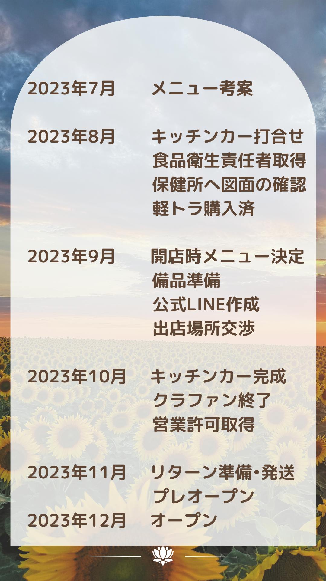 2023/09/29 23:21こんにちは!そうママです!応援して頂いている皆様、ご支援頂いた皆様本当にありがとうございます!現在そうちゃん号の出店場所交渉を進めています。イベントなどにもお声がけ頂いているので、オープン予定日になるであろう、出店予定のイベントをご紹介致します。他にもJA稲敷新利根直売所で行われている、マルシェなどにも出店予定です!正式に出店が決まりましたら、Instagramでご紹介します!ぜひInstagramも一度覗いてみて下さいください。 もっと見る