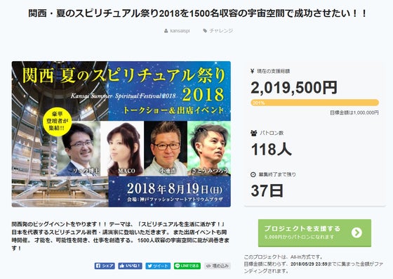 2018/06/01 21:13 「関西・夏のスピリチュアル祭り2018を1500名収容の宇宙空間で成功させたい!!」の4月20日より5月29日までのクラウドファンディングが終了しました。 おかげさまで、306名様のパトロンに恵まれ、4,743,500円のご支援を集めることができました! チャレンジジャンルでは、歴代2位の支援額という快挙も成し遂げることができました! 改めて、心より感謝申し上げます!! ありがとうございました! 今後は、フェイスブックイベントページおよび公式ウェブサイトにて情報を発信していきます。 最新情報はそちらでご確認いただければと思います。 ・フェイスブックイベントページ ・公式ウェブサイト みなさまからいただいたご信頼を裏切らないように、 イベントまで準備をしっかりと進めていきます。 このたびは、本当にありがとうございました!! 実行委員会代表 冨樫 功 もっと見る【チャレンジで歴代5位に浮上!!】