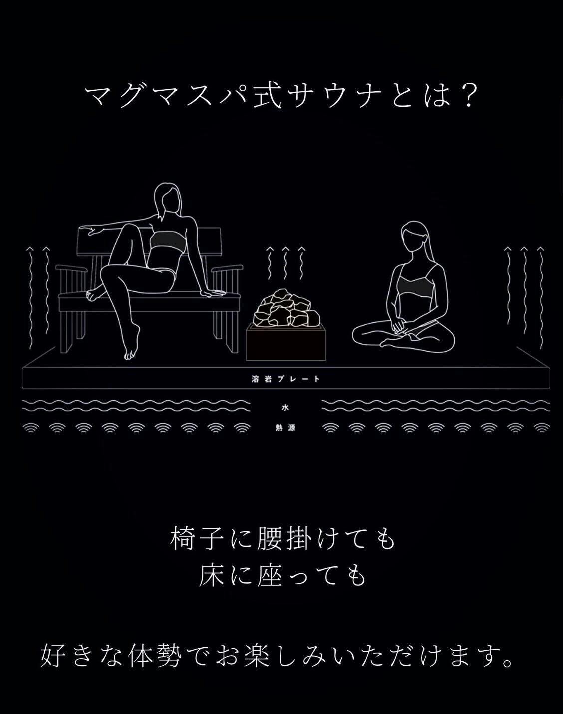 サウナルーム内の床一面と壁には、自然の恵みをそのまま切り取ったMAGMA(天然溶岩)プレートを敷き詰め、溶岩が持つ高い反射熱効率と育成光線温力の輻射熱熱により心地よく体内深部温度を高めることが可能です。