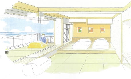 青色が美しくとけ合った海と空、心を癒してくれる波音を聞きながら時の流れを忘れゆっくりと眺めて頂きたいとの思いから「テラスリビング」なる貴方だけの特等席をご用意致します。