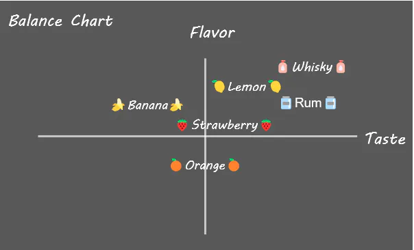 オレンジ、ストロベリー、バナナ、レモン、ラム、ウイスキーの6種類。