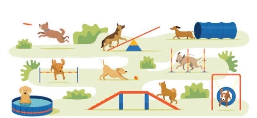 "子ども達が公園の遊具で遊ぶ感覚"でわんちゃん達にも色んな刺激を感じて欲しいという思いから、アジリティ広場を作ろうと考えました。