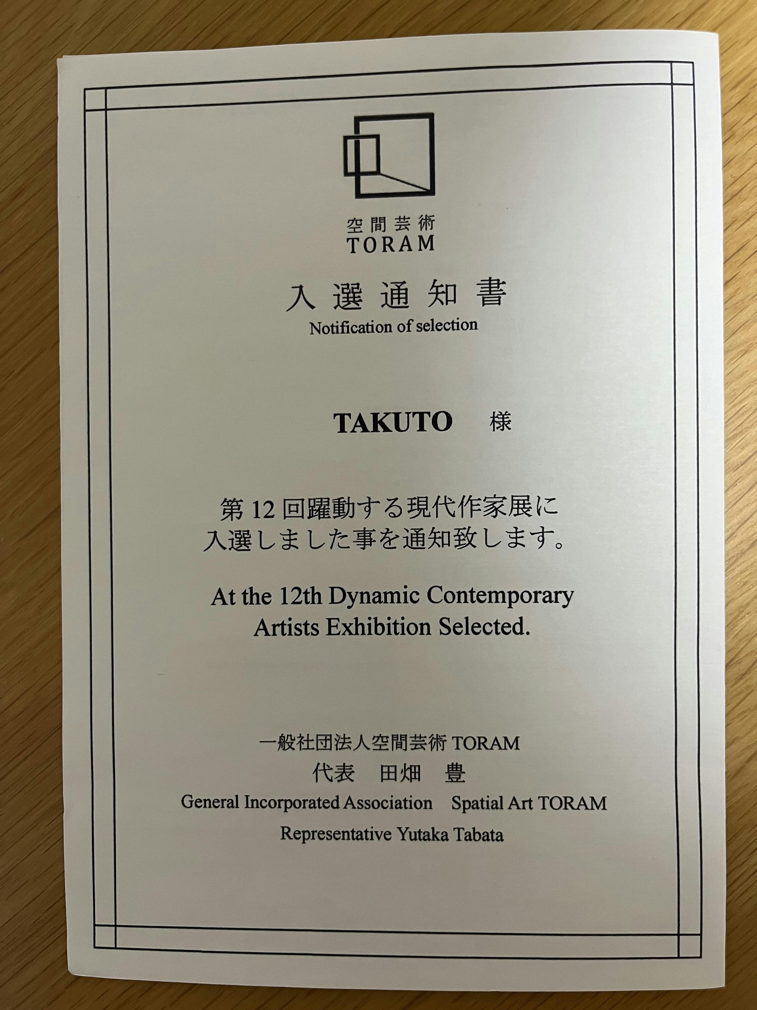 先日、一般社団法人空間芸術TORAM様主催『第12回躍動する現代作家展』に入選致しました。