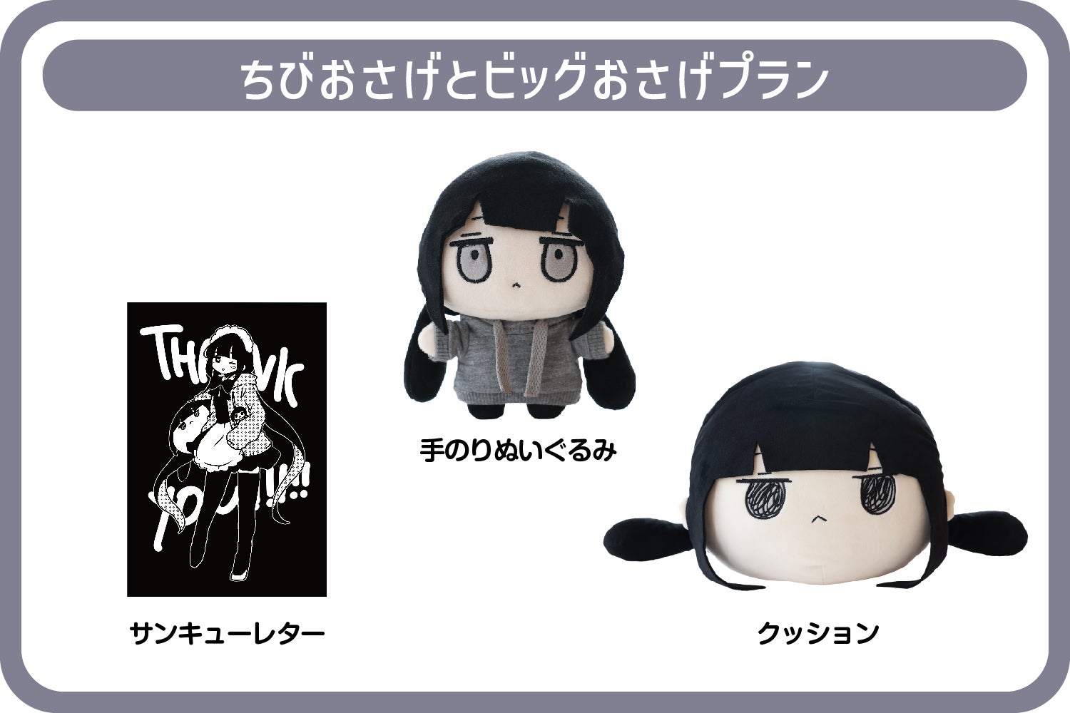 手のりぬいぐるみ2個とクッション2個、グッズセットのプランです。