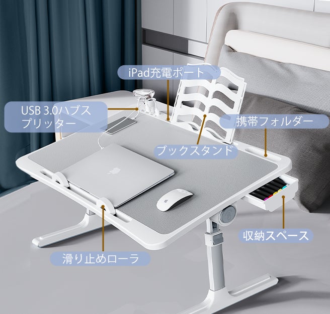 iPad、携帯立て、収納スペースがついているので、ペンや本など、様々なものを収納できるので、机の上にたくさんの物があふれることなく、幅広くスペースを利用でき作業を行うことができます。