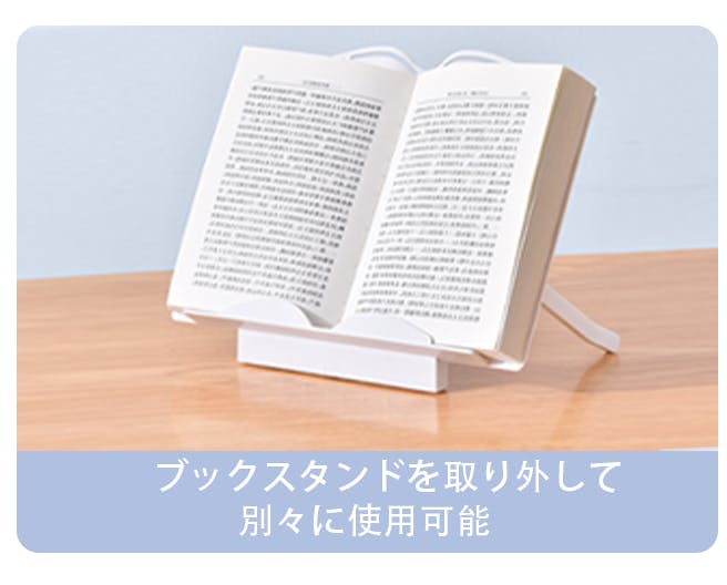 デスクには取り外し可能なブックスタンドが付き、必要な時に本をブックスタンドに軽く置くだけで簡単に固定でき、本を持たずに読書できるので非常に便利です。