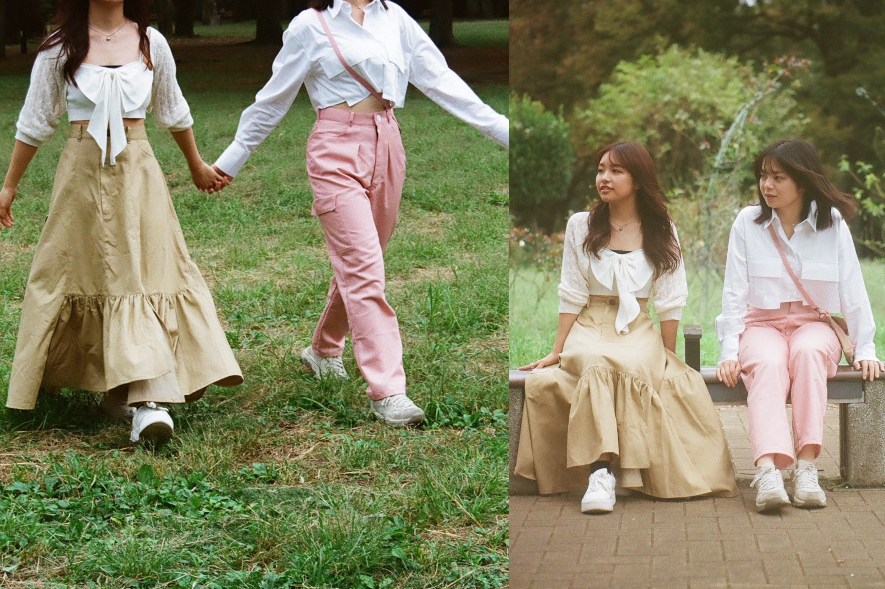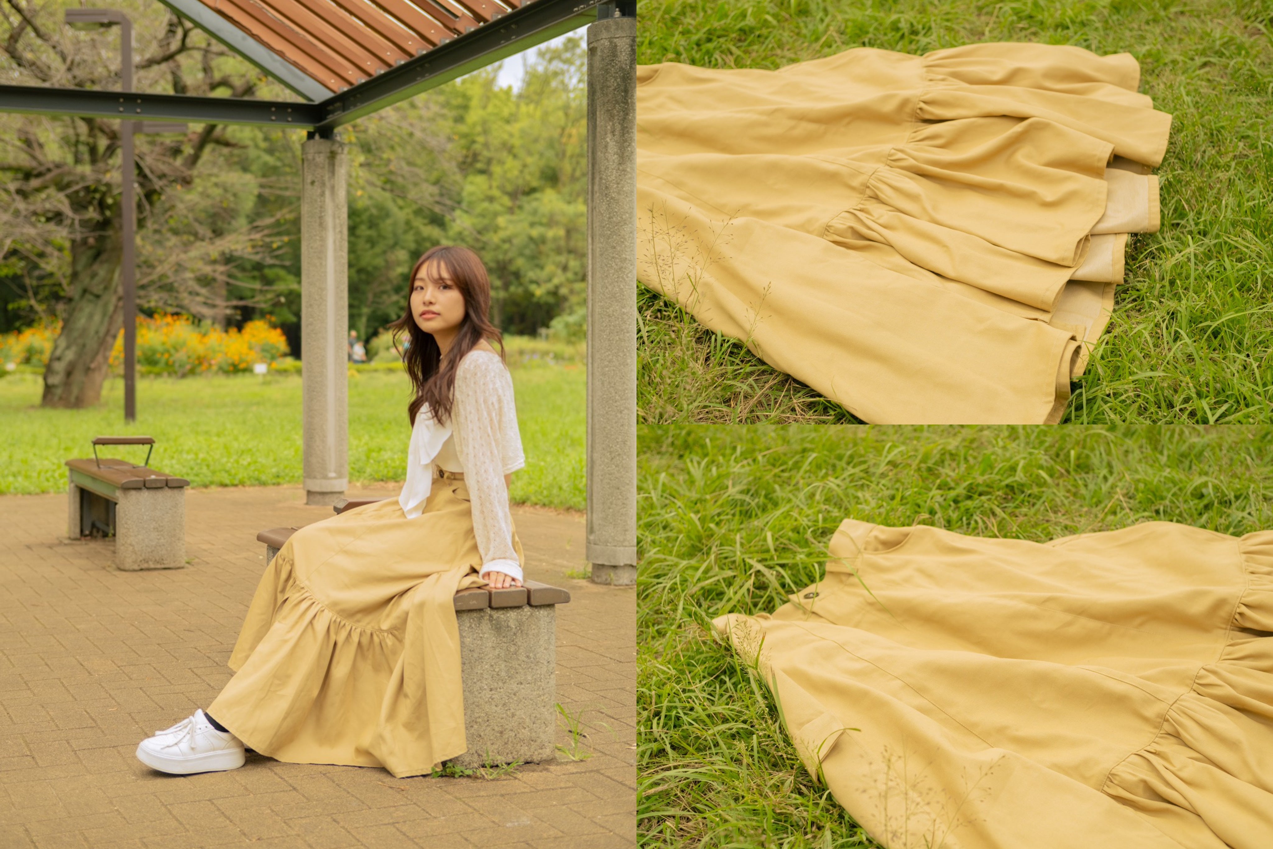 足元が見えるデザインのためロングスカートでも重たくならないようにしました。