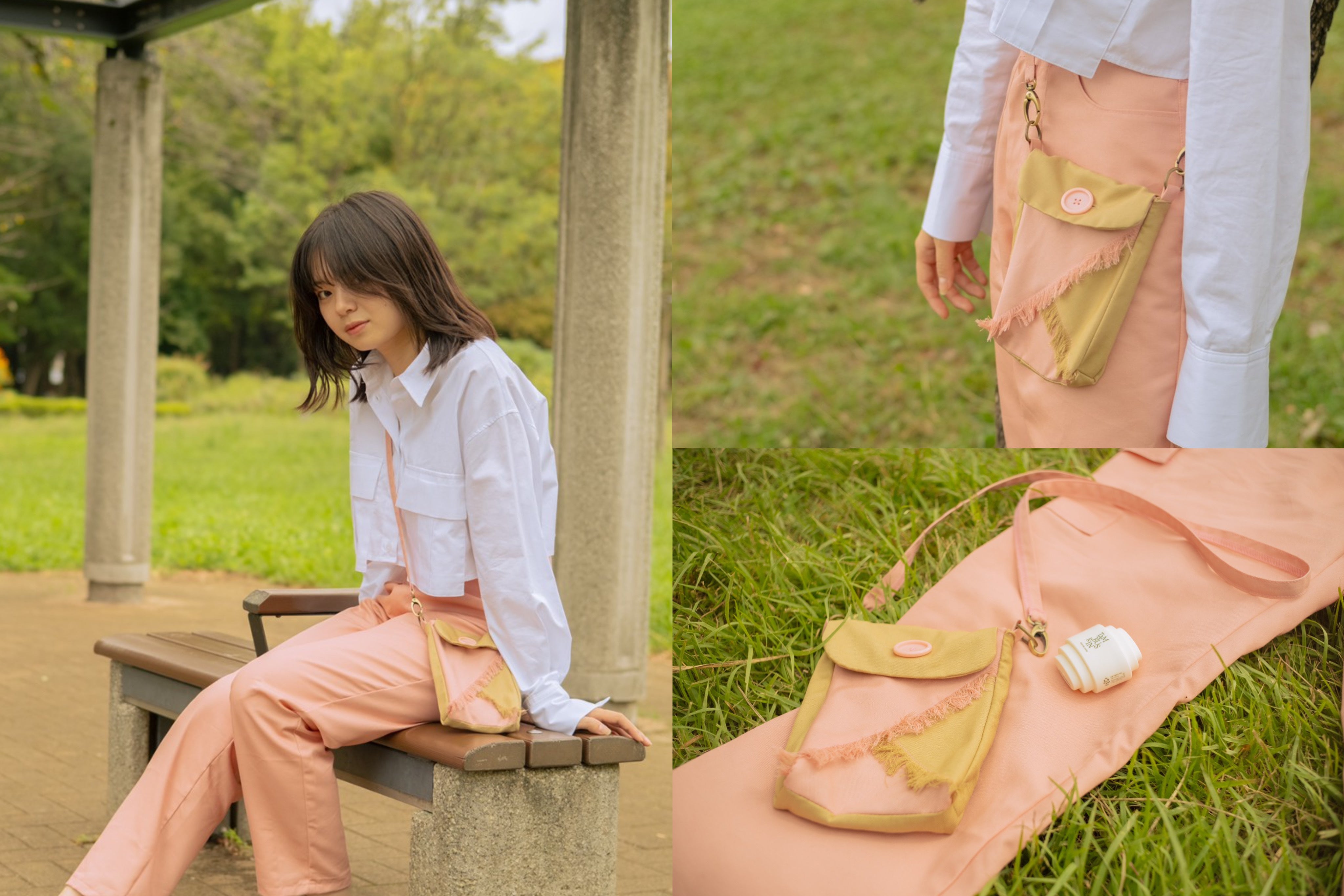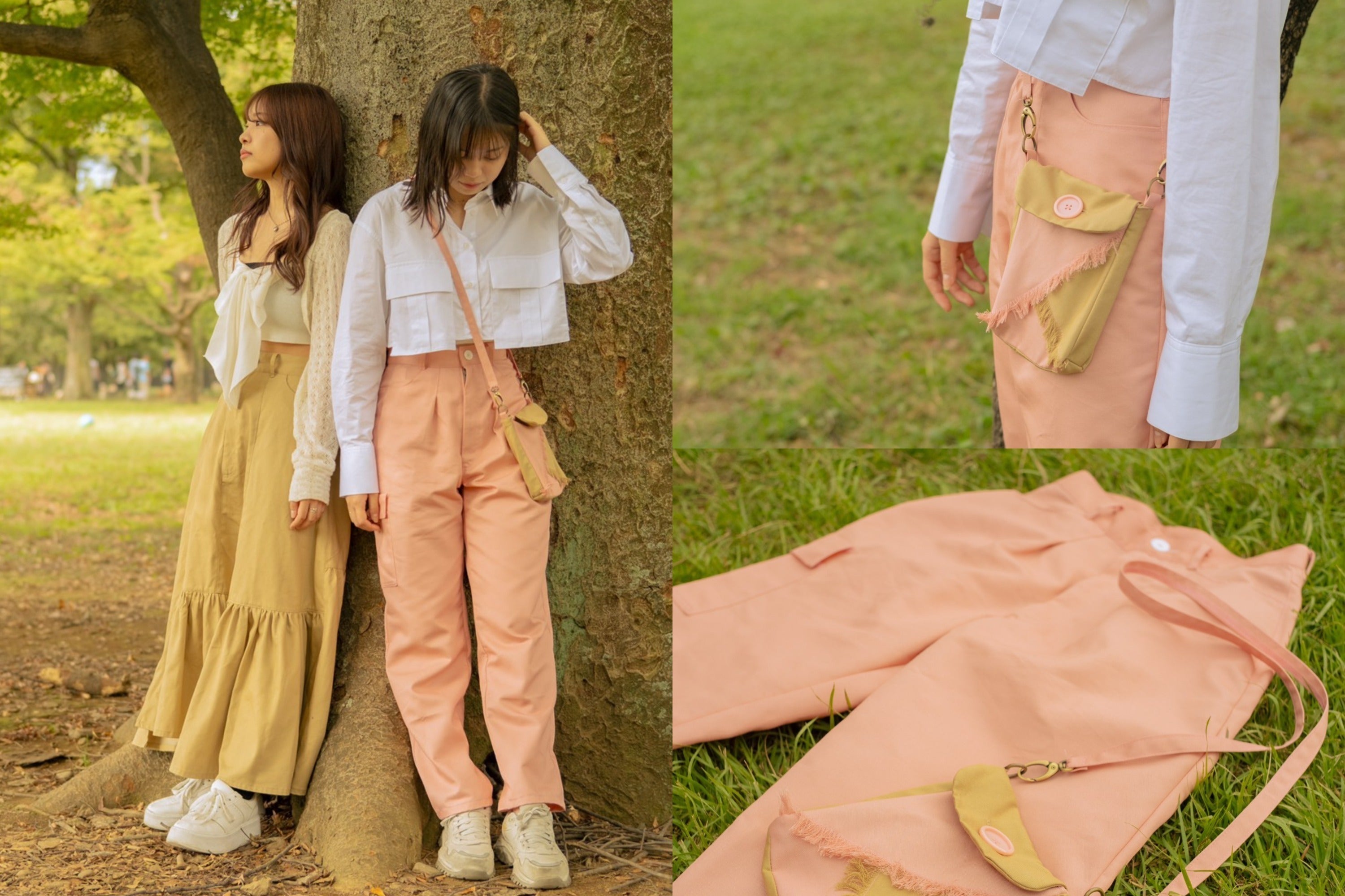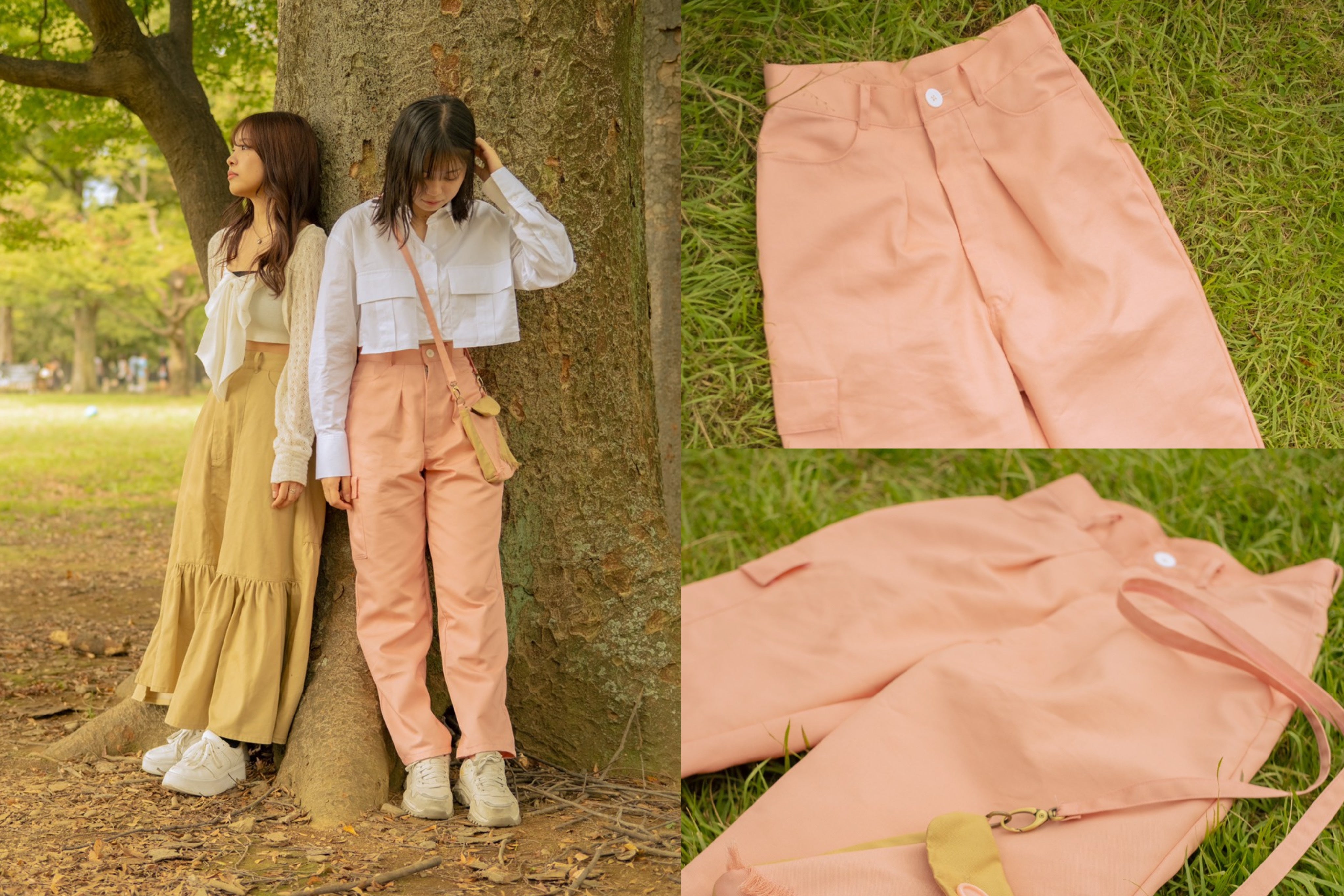 ピンクのカラーデニム使用し、タックやポケットのついた