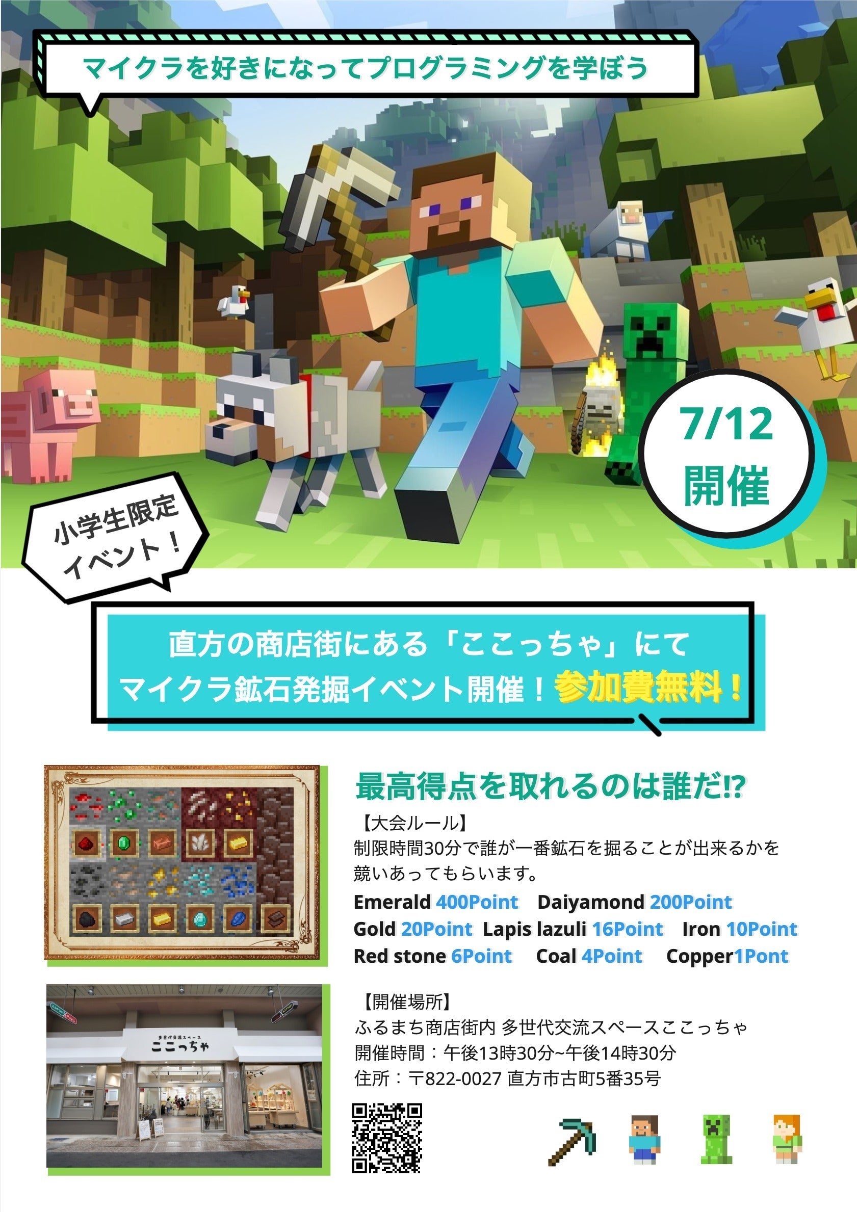 • こんにちは、Take AIの八尋です。2023年12月に開催しました「マイクラ大会」の第2回を2024年1月28日に開催しました。開催場所は、前回と同じく直方市の商店街の中にある多世代交流スペース ここっちゃさんです。Instagramの投稿はもちろんの事、今回は2つの小学校にチラシの配布をお願いしたりと広報活動を拡大した結果、前回よりも多くのお申込み依頼がきました。大会当日は、前回より参加人数が多くなった事もあり、私たち運営の至らなさで、もしかしたらご迷惑をおかけした事があったかもしれませんが、無事前回よりも大いに盛り上がり、イベントはまたまた大成功で幕を閉じました。そして、今回も子どもたちから「もう1回参加したい」と嬉しい言葉をいただきましたので、今後は定期的にイベント大会を開催する事を決めましたので、今後の動向を楽しみにしてください。クラウドファンディングの募集期間がまもなく終わりますが、まだまだ支援が足りないのが現状です。子どもたちがマイクラで遊びながらプログラミングを学ぶ場所を作る為にも、皆さまの引き続きご支援のほど宜しくお願いいたします。 もっと見る