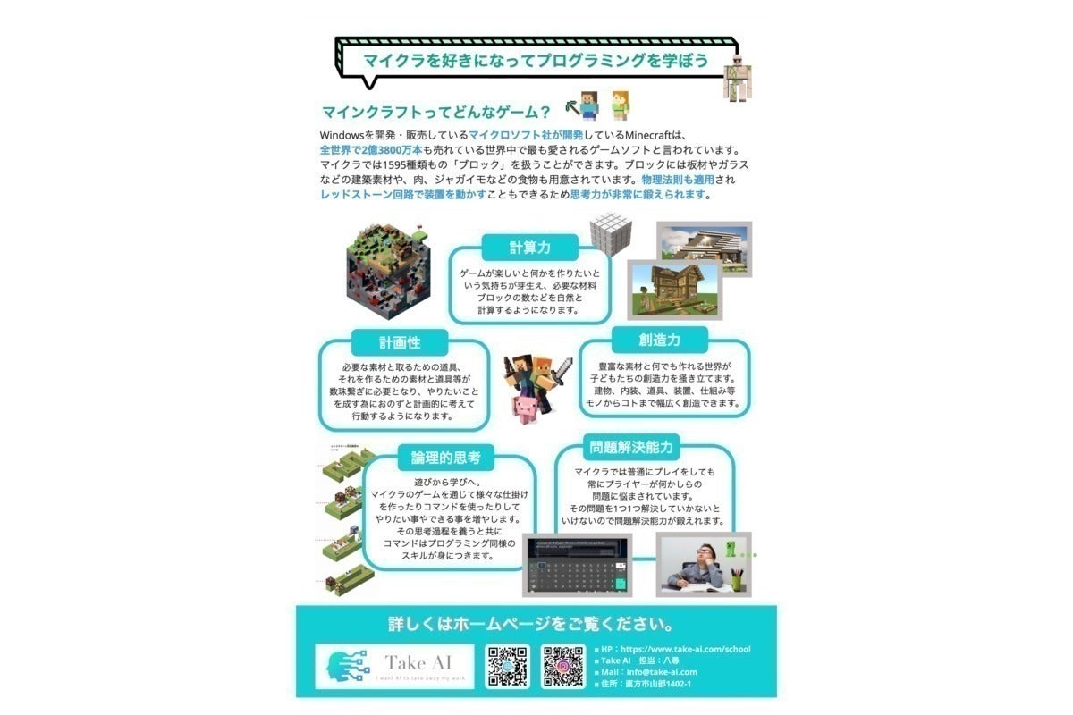 マインクラフトは小学生たちの間での認知度・人気ともに高い為、ゲームで楽しく遊びながらプログラミングも学び興味をもってもらい、更にコマンド入力は英語で入力するので英語の知識習得もできるという一石三鳥の取り組みではないかと思います。