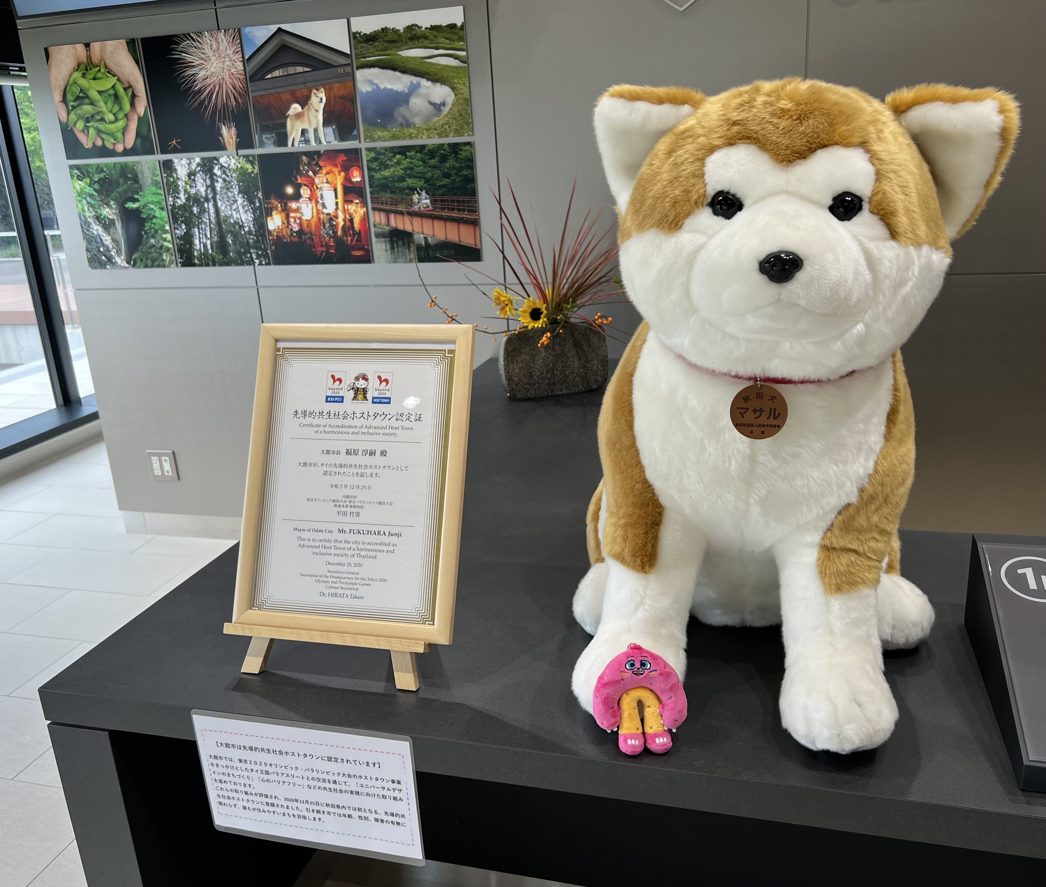 大館市役所の入り口には、はち公のぬいぐるみと認定書が飾られています。