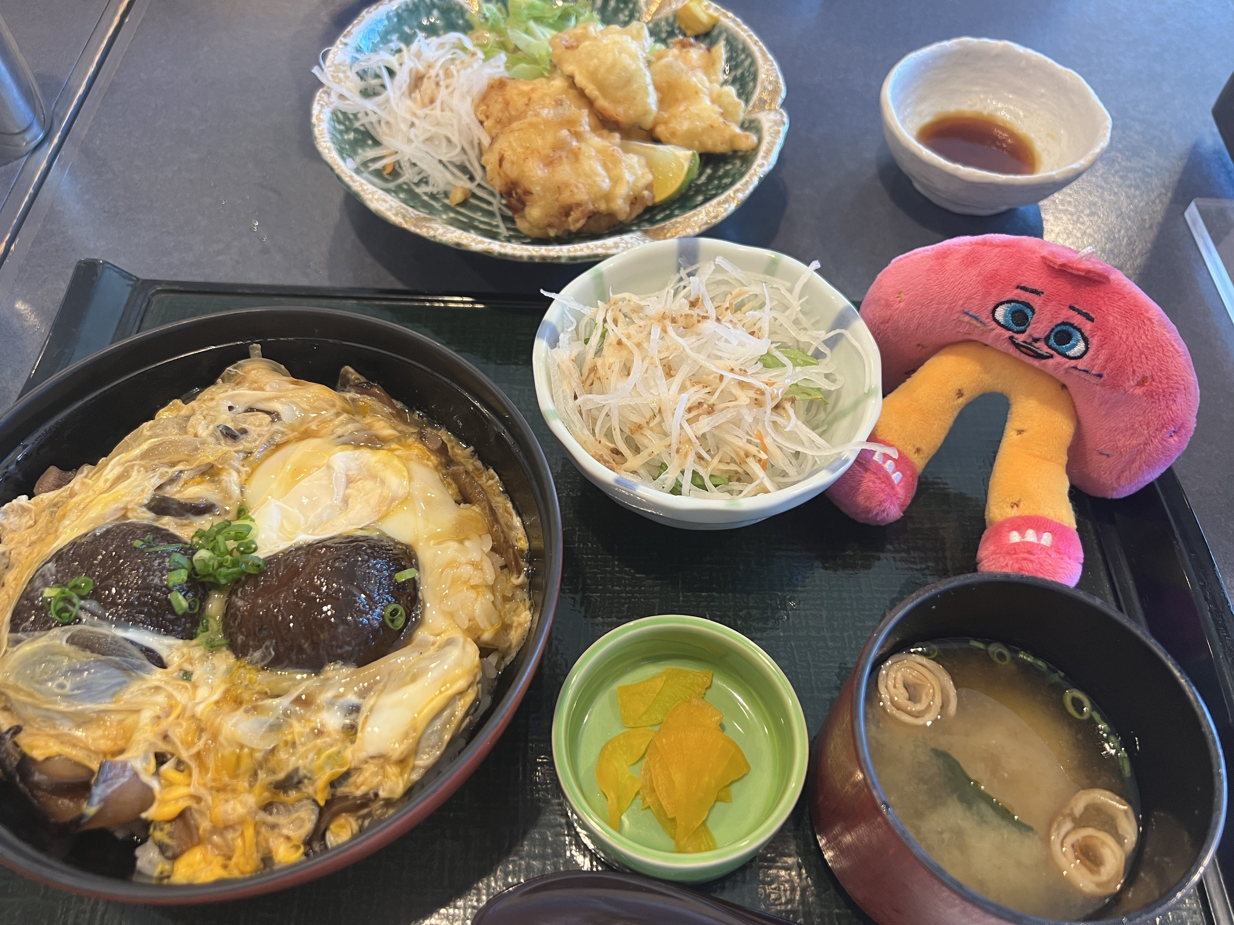 イベント翌日の大分空港のレストランにて。とり天はからしをつけて食べるとさらに美味しいですよね。大きいしいたけも有名なので、空港のおみやげコーナーにもたくさんありました。ここで食べる<しいたけ丼>は、しいたけとたまごの相性がとっても◎ 是非、お試しください♪