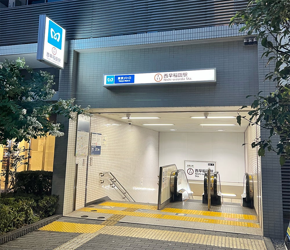 外看板を目印に、西早稲田駅1番出口からエスカレータを下りてすぐです!