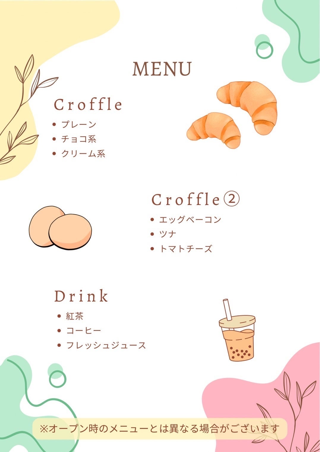 (上記画像のメニューはイメージですが、美味しいクロッフルとドリンクを販売予定です)