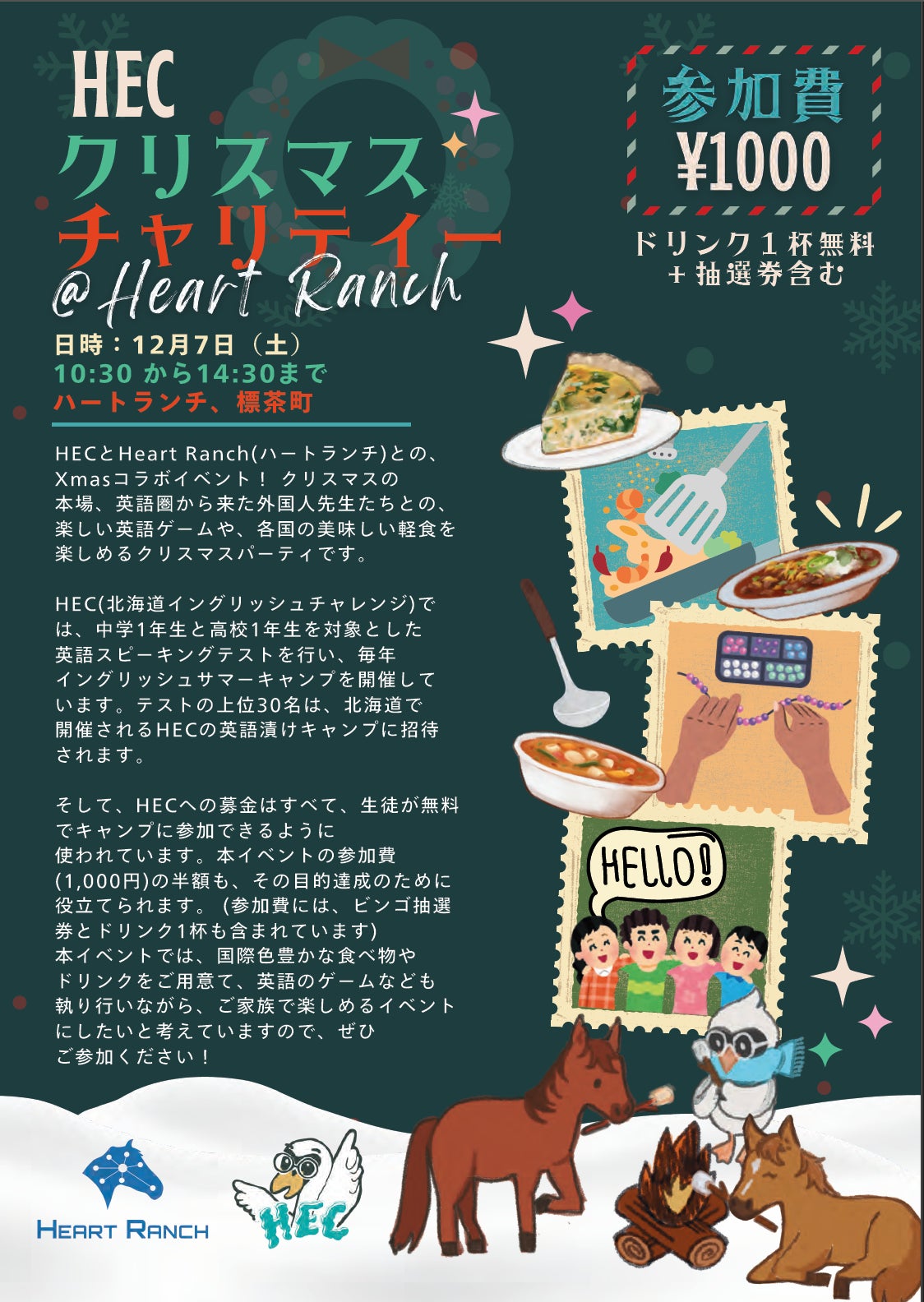 今年、HECの20周年を記念して、HECクリスマス・チャリティー@Heart Ranchを開催いたします。海外のクリスマスをイメージしたカフェメニューや、ALTの先生たち(10名)による楽しいアクティビティも企画していますので、ぜひお楽しみに!