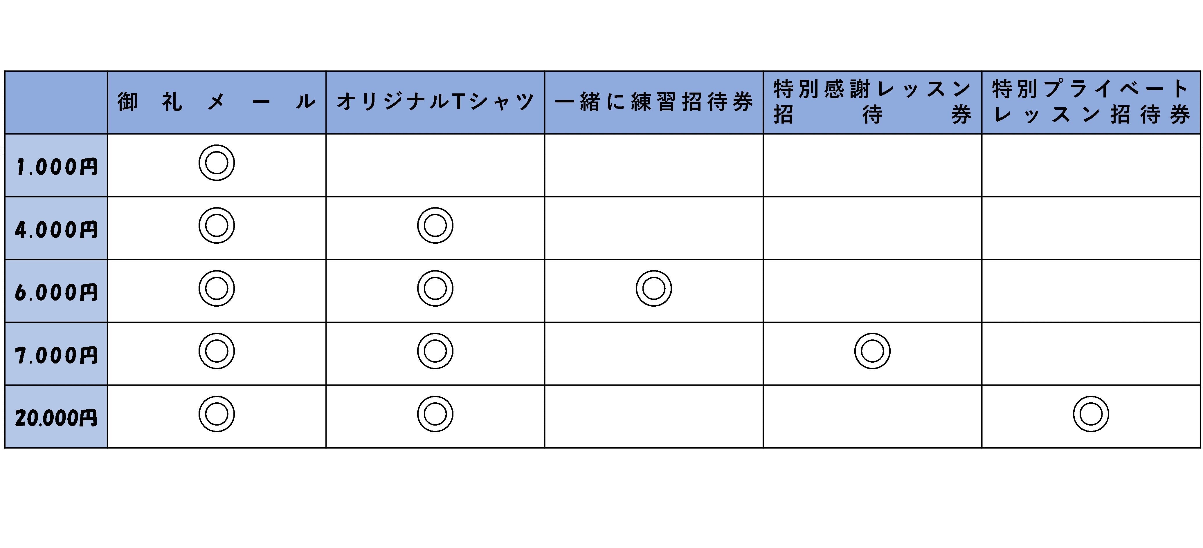 上記三つのリターンでは「一緒に練習招待券」「特別感謝レッスン招待券」「特別プライベートレッスン招待券」の三つの招待券が設定されています。