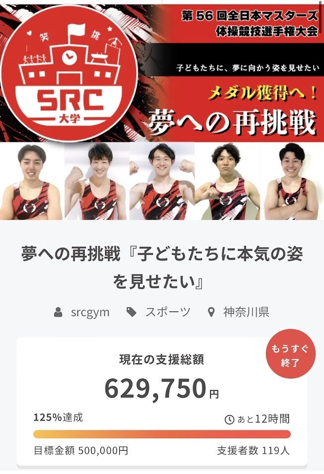 こんにちは!SRC大学の竹内です(*^_^*)いよいよ本プロジェクトが最終日となり終了まで残り12時間となりました!!支援してくださったみなさま本当にありがとうございます!<( _ _ )>現在のところ、「達成率“125%”」「支援者数“119人”」となっております!!「応援に行きます!」「Tシャツ買いました!」と直接声をかけてくださったり、プロジェクトページの応援コメントにも温かい言葉をかけださりとても嬉しく思います!柏木先生の一言からマスターズ出場やこのプロジェクトが始まり、「本当に自分にできるかな」と不安な気持ちが多くありましたが、諦めることなく挑戦し続けて良かったと思っています!そして、試合まで残り一か月となりました。まだまだ未完成な演技があります、練習も含め試合まで全力で取り組んでいる姿を見せることができるよう、みなさんに「ありがとう」という感謝の気持ちを持ちながら頑張っていきます!今後とも応援よろしくお願いいたします!!