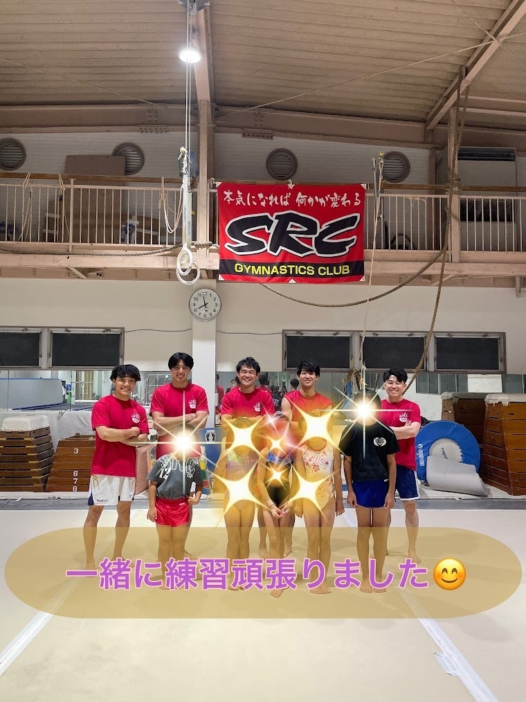 こんばんは!!めっちゃ練習をして肩回りの筋肉痛がすごいSRC大学の竹内です!(⊙ˍ⊙)本日、支援をしてくださった子ども達がSRC大学メンバーと一緒に練習を行いました!!子ども達も大会がもうすぐに控えているので、子どもも大人も関係なく「はい!お願いします!」と手をあげて通し練習を行っていました!成功したらハイタッチをし合いながらみんなで盛り上げながら楽しく練習できました!o(^▽^)o最後には子どもは「前宙」、大人は「前方1回半ひねり」や平行棒で「後方屈伸二回宙返り」で体操選手ならやったことあるであろう“着止め”を行い、大盛り上がりで練習を終えることができました!上から見ていた保護者の方々からも「見ていてとても楽しかったです!」などと声をかけてくださり、このような時間を設けることができてよかったなと感じているのと同時にまたこのような時間を作って一緒に楽しく練習したいなと強く思いました!そしてそして、普段は曜日も時間もバラバラに仕事をしていてなかなか集まれなかった団体メンバー……集結です!!q(≧▽≦q)この6人を中心に子ども・大人全員が1つのチームとなり戦っていきます!残り3週間今以上に気を引き締めて頑張っていきます!これからも、応援のほどよろしくお願いいたします!(良い写真すぎてすぐにパソコンの背景に設定したことは内緒です笑)ここまで、読んでくださりありがとうございました!では!