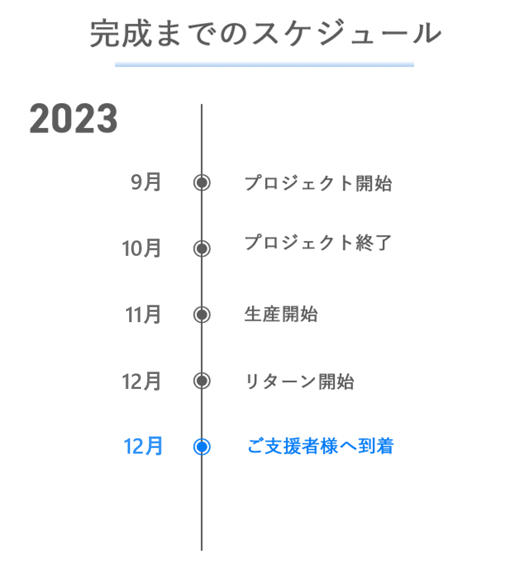 ※本文中に記載させていただいたスケジュールは、あくまでプロジェクト公開時点の予定です。支援の性質上、配送遅延のおそれがございます。