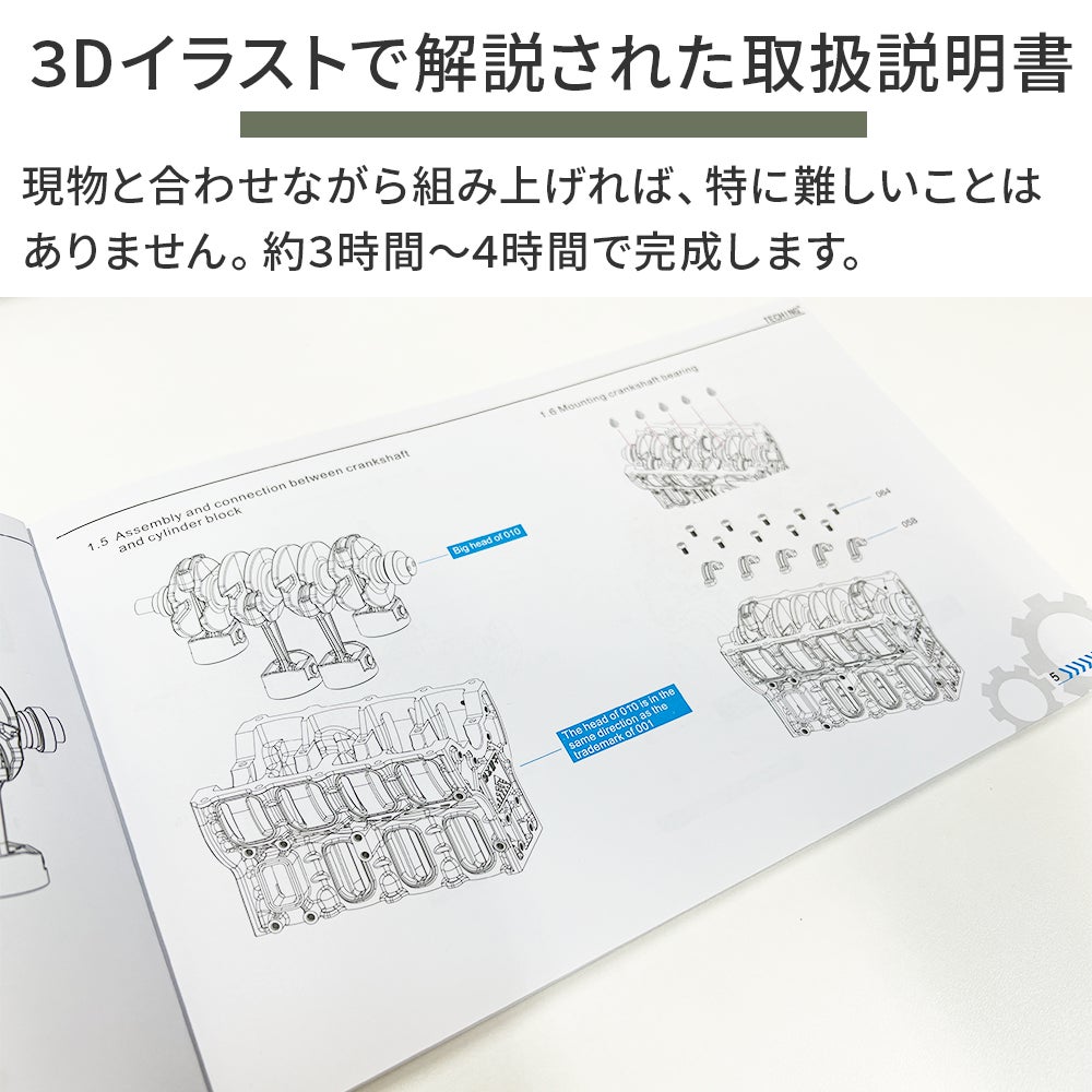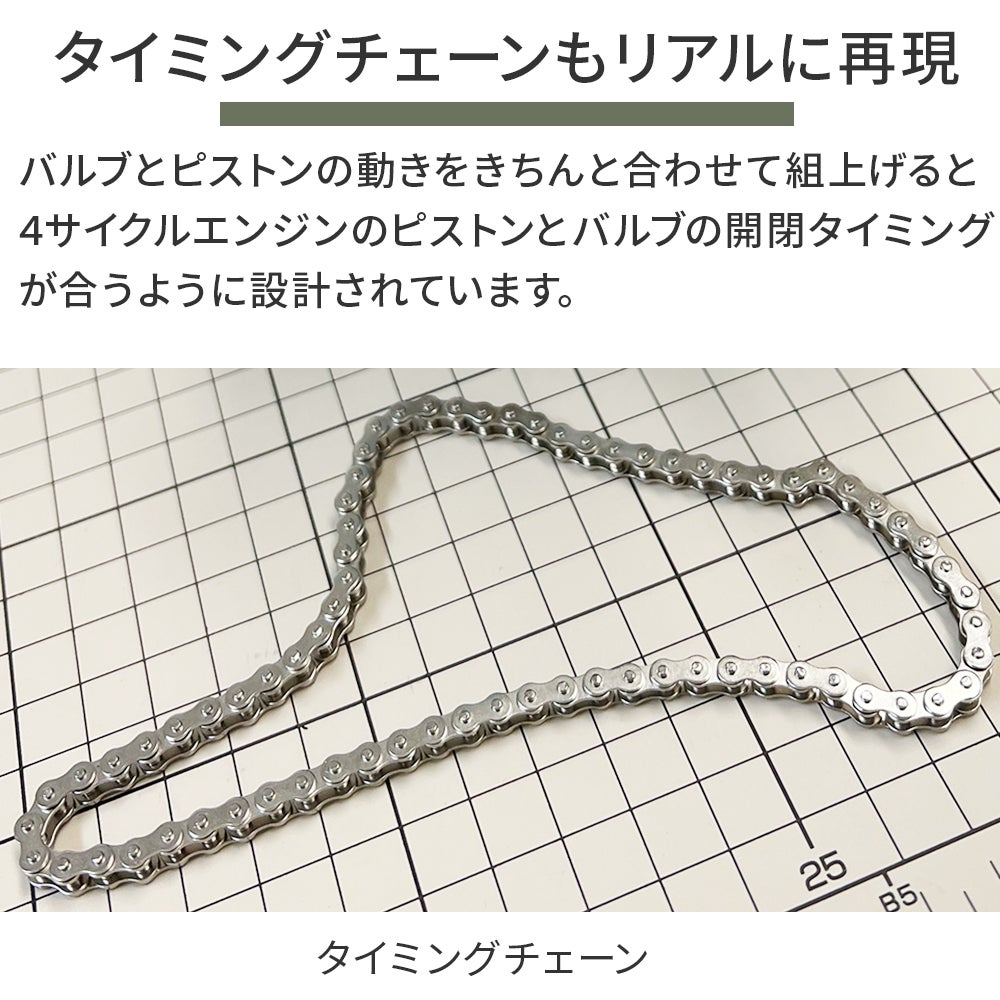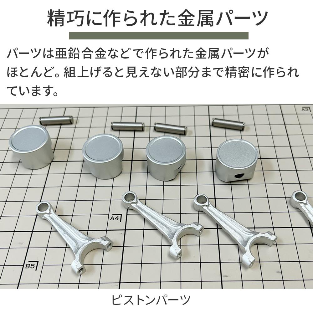 完成後はモーターで駆動し、ピストン、クランク、カムシャフト、さらには吸排気バルブやロッカーアームなど、実物さながらの動きをみせます。