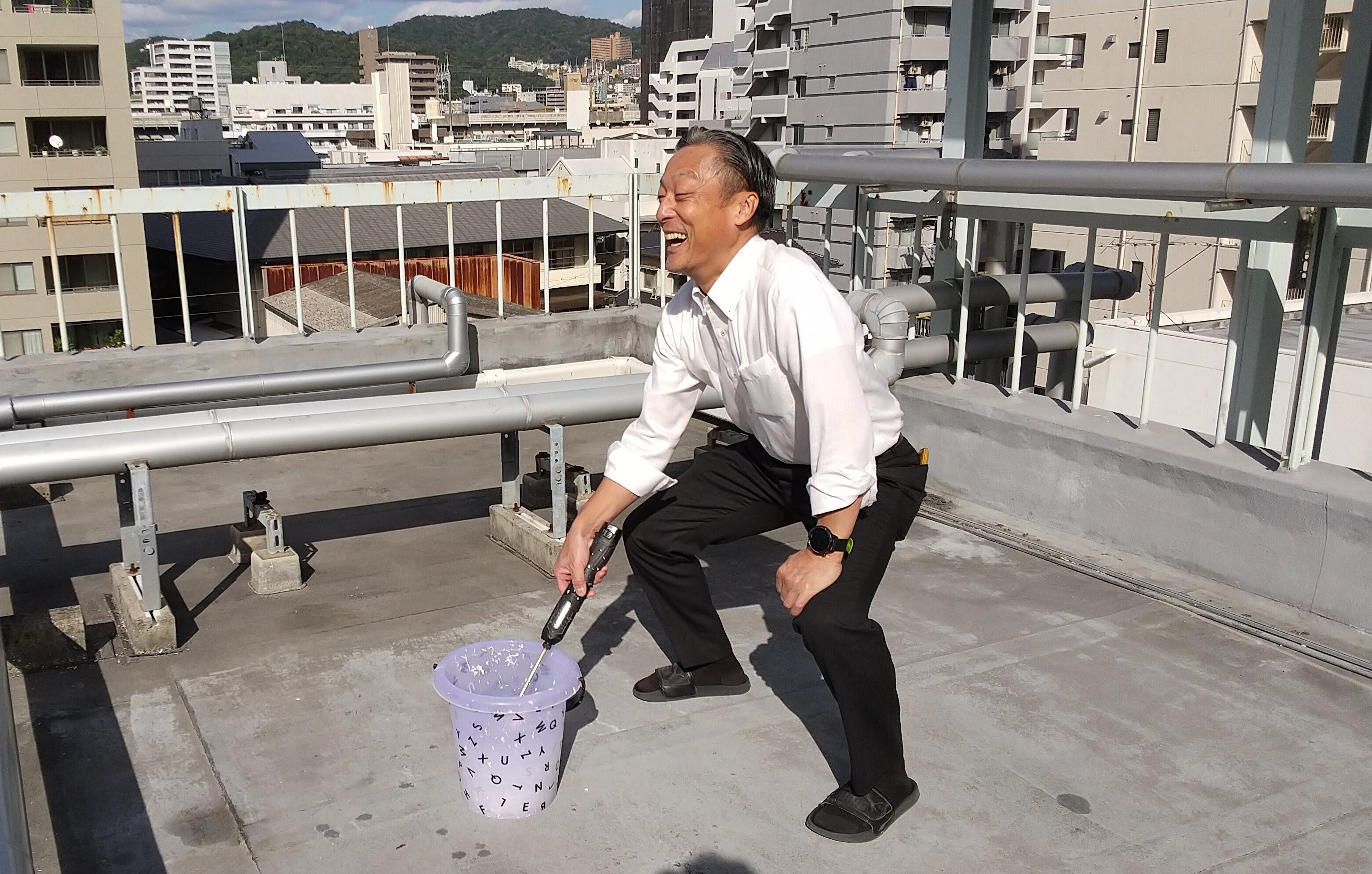 細かくするために、本来は塗料をかき混ぜるミキサーを使ってかき混ぜてみると、