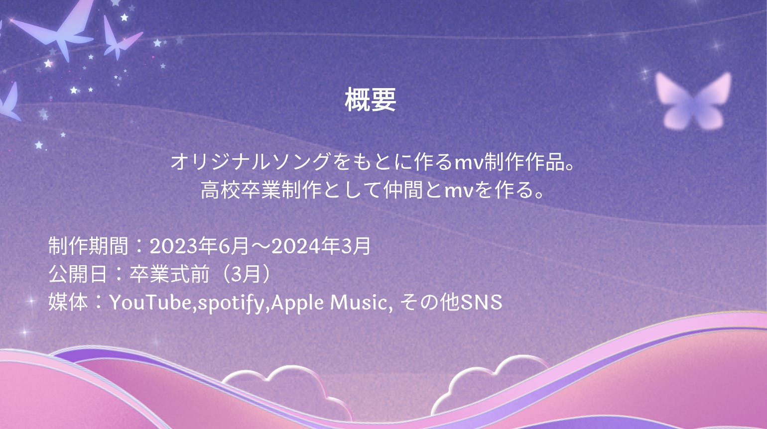 私たちは、高校生ならではの感覚と熱い想いを込めたオリジナルMVを制作し、多くの人に感動と勇気を届けたいです。青春時代の輝きと、未来に向き合う姿を映像で表現し、共感を生む作品を創りたいと考えています。
